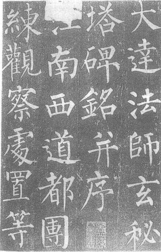 唐。刻石。会昌元年(公元841年)十二月刻。碑高305厘米,宽170厘米。存于陕西省西安碑林。柳公权(唐大历十三年—咸通六年,即公元778—865年)。字诚悬,京兆华原(今陕西省耀县)人。幼年嗜学,能赋辞。元和初中进士,历官秘书省校书郎、工部侍郎、太子少师,封河东郡开国公,世称“柳河东”。卒,追赠太子太师。工书,精于楷书,亦擅长行草,并能作篆书。初学二王,后专于欧、颜体书,“体势劲媚,自成一家”,与颜真卿齐名,有“颜筋柳骨”之称。历代对柳书评价很多。宋朱长文《续书断》云:“公权博贯经术,正书及行,皆妙品之最,莫不失能。盖其法出于颜,而加以遒劲丰润,自名一家。”苏轼云:“柳少师书本出于颜,而能自出新意。一字百金,非虚语也。”明董其昌《容台集》云:“公权正书及行皆妙品之最,草不失能,盖其法出于颜而加以遒劲丰润,自名一家。”清康有为《广艺舟双楫》云:“诚悬则欧之变格者,然清劲峻拔,与沈传师、裴休等出于齐碑为多。”传世作品有《金刚经刻石》、《玄秘塔》、《神策军碑》、《大观帖》、《蒙诏贴》、《送梨贴跋》等。《旧唐书》卷百六十五、《新唐书》卷百六十三有传。玄秘塔是大达法师端甫埋骨之塔。端甫,俗姓赵,陕西天水山人,贞元十三年应德宗之诏,出任皇太子的法师。元和元年供奉左街僧录,于开成元年圆寂。会昌元年为其立碑。此碑由裴休撰文,柳公权书并篆额,邵建和、邵建初镌字。碑额题“唐故左街僧录大达法师碑铭”。碑阴刻有“纪纲重地”四大字,又有“大中六年比丘正吉”题字。碑又称《大达法师玄秘塔碑》、《大达塔碑》。碑文共18行,行54字,是柳公权64岁时所书,为其典型的书法代表作品。其笔力遒劲挺健,点划瘦硬锐利,笔锋方圆兼备,结体严紧爽朗,通常作为人们学习楷书的入门范本。明王世贞《弇州山人稿》云:“此碑柳书中之最露筋骨者,遒媚劲健,固自不乏,要之晋法亦大变耳。”明赵崡《石墨镌华》云:“虽极劲健,而不免脱巾露肘之病,大都源出鲁公而多疏,此碑是其尤甚者。”此碑拓本以宋拓为最佳本。北京故宫博物院藏有此碑拓本。商务印书馆和文物出版社有影印本。