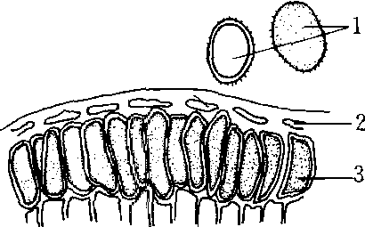 栅锈菌属 1.夏孢子 2. 寄主表皮细胞 3.冬孢子 |