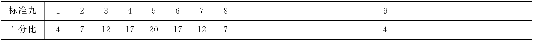 “标准化九级分制”的简称。正态标准分数的一种形式。是一个一位数字的分数系统,其均数为5,标准差为2,分数全距为1—9分。各标准九所对应的正态分布中的百分比如下表所示。该分数亦是一种正态化的标准分数,凡接近正态分布且可排列高低顺序的资料均可使用,按下表将得分最高的4%的受测者每人给9分,其次7%的受测者给8分,依此类推。