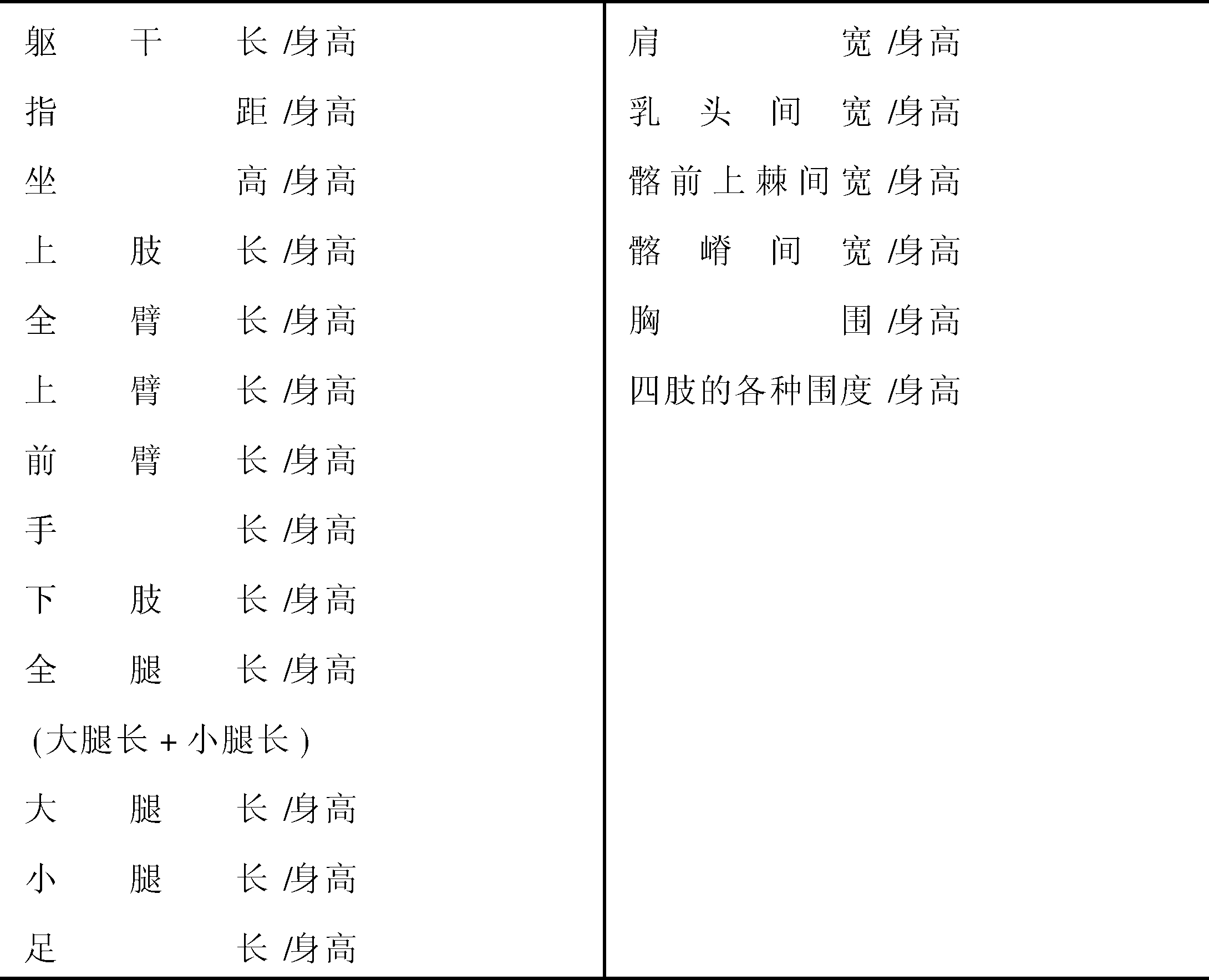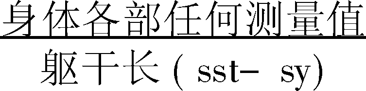 在体部测量中,可采用两种以上的测量值组成各种不同的指数,以表示身体各部分的比例和形状特征。 ❶标准指数 a=×100 ❷标准指数 b=×100 为了比较起见,身体各部任何一项测量值均可分别与身高值或躯干长值组成比例,故上述两指数被称为标准指数。