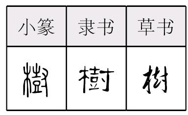 树樹shù 春秋初期石鼓文从木,在豆上,寸作又。象用手植树木在坛台(豆)上,种树义。转为名词:指树木。《说文》所载籀文作尌。“又”变寸。小篆将木变屮(chè),后隶楷都作尌(shù),是树(樹)的本字。小篆加木旁作樹。汉代以后草书字形近树。约元代作树。其中用“又”作符号,如劝权艰对例。现以树为规范字。见《总表》。现主要指木本植物的总称。仍有种植、栽培义。如:十年树树,百年树人(树人的树是引申义)。引申为立,建立。如:树雄心,立壮志。组词如:树立。