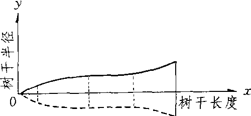 | 释义 | 树干曲线stem curve指沿树干中心假设的主干轴剖开形成树干的纵剖面,在剖面外缘所形成的曲线。用于描述树干形状。通常将树干的横断面近似地视为圆形,其半径为树干横截面长、短径的平均值。因此树干曲线一般是指树干平均半径与其所在树干上位置距树梢距离的函数图象。将树梢顶点置于直角坐标原点,树干中轴与x轴重合,则树干曲线方程为y=f(x)。树干曲线自基部向梢端的变化大致可归纳为凹曲线、平行于x轴的直线、抛物线和相交于x轴的直线等4种曲线类型。若将树干视为干曲线以x轴为轴的旋转体,则4种曲线的体型依次为截顶凹曲线体、圆柱体、截顶抛物线体和圆锥体。
