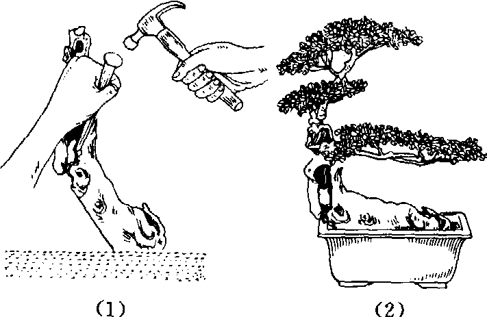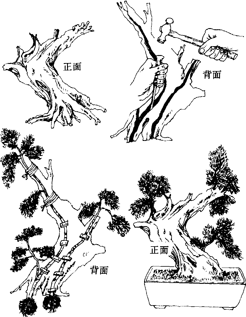 图1 树干雕刻示意 贴木法 用一枯桩(或老根)(图2),在背面适当部位刻一竖沟,沟宽与将要嵌进去的树干相吻合,然后将一棵主干形态欠佳或幼年树苗的树干嵌入沟中,用棕丝绑扎固定,外面涂以湿泥、苔藓。1~3年后,小树干紧嵌在枯桩的深沟中,两者一体,宛若天生。这种方法制作的盆景苏州称“靠贴式”。苏州的菊花古桩盆景,北京黄土岗的“劈柴梅”,也用此法制作。