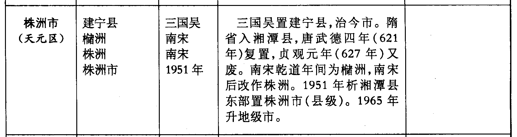 株洲市(天元区)建宁县洲株洲株洲市三国吴南宋南宋1951年三国吴置建宁县,治今市。隋省入湘潭县,唐武德四年(621年)复置,贞观元年(627年)又废。 南宋乾道年间为洲,南宋后改作株洲。1951年析湘潭县东部置株洲市(县级)。1965年升地级市。