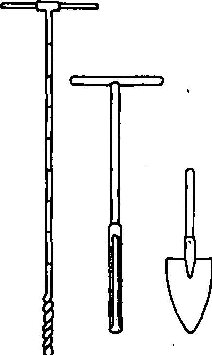 特殊土样的采集 是指水田、盐碱土、土壤剖面和诊断土样的采集。水田土样的采集,可用具有刻度的管形取土器,钻入一定深度的土层,取出土钻时,上层水即流去,剩下潮湿土壤,装入塑料袋里。剖面土样的采集,为了研究土壤基本理化性状,除了采集表土外,还要采集表土以下的各层土壤,可以自下而上,在各层最典型的中部采取。土壤盐分分析样品的采集,应以定点、垂直深度分层“段取”,以便计算储盐量。研究盐分垂直分布特点时,则多用“点取”,还应重视采样的时间和深度。花碱土由于碱斑分布的特殊性,必须增加样点的密度,并要随机取样。诊断土样的采集,为了查证作物生长不正常的土壤原因,应采取具有典型现象的土样,同时还要采取附近正常地段的土样,作为对照样品,以比较诊断。采样工具,有三种类型:小土铲、管形土钻和普通土钻(图2)。 土样的制备 一般多用风干样品,只有某些特殊分析项目才用新鲜样品。从野外取回的土样,都要经过制备,拣去植物残根、肥料块等侵入体和铁锰结核、石灰结核等新生体。风干、磨细、过筛、混匀,装入磨口塞广口瓶或塑料瓶中,样品瓶内外各有标签,供各项测定之用。瓶口应涂石蜡密封,保存在避免日光、高温、潮湿和有害气体污染地方。土壤的pH值、亚铁、还原性硫及速效养分等在风干过程中易发生显著变化,因此,测定这些项目时,一般均用新鲜土壤。最好将新鲜土样经过速冻固定,并立即进行快速例行分析。目前已在调查船或野外监测车中应用。 标准土样 用来核对分析人员对各批样品分析结果的准确性,或作为分析方法比较试验用,有时也作为基准物质的代用品。需长期保存,样品瓶口应以石蜡涂封保护。标准样品的各项分析结果应用专册登记保存。