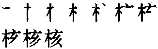 核 金文; 篆hé[木(意符)+亥(聲符)→核(《説文》:“核,蠻夷以木皮爲篋,狀如奩尊。從木,亥聲。”核,這裏所説“奩尊”是指木制的首飾盒。核,今指保護種子的硬殼。因其在果實的中間。引申爲“核心”(nucleus)。近代科學發現原子的中心有一個品質很高的東西,稱它爲“原子核”(atomic nucleus),簡稱核。“核能”即原子能。又用以指有核的果品,如桃、杏、李、梅、棗等。與英語nuclear〈核;細胞核;原子核〉。邏輯相通nuclear源於拉丁語nux〈核桃;果核〉。)]《詩經·小雅·賓之初筵》:“籩(biān)豆有楚,肴核維旅。”(大碗高碟按序排,佳肴鮮果先後來。) 核(10画) ❶hé [覈] ❷hú