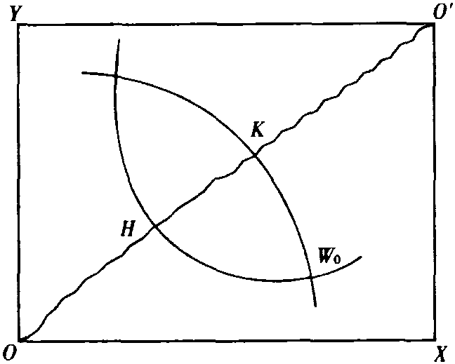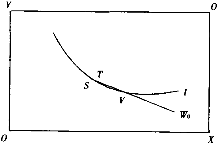 图2 在2人的纯交换经济中,核就是如图1的梭形内契约曲线HK部分,如果将这一简单经济“复制”一遍,得到一个4人纯交换经济,可以证明,核将缩小。如图2所示,这时左下角的2人(称为A 1和A 2)可以与右上角的1人(称为B 1)联合起来,使B 1达到H点,即(x HB,y HB)点,也就是说,B 1用△Y=y 0B-y HB与A 1和A 2交换得到△x=x HB-x 0B,其中(x 0B,y 0B)是B 1在W 0点的配置。如果A 1和A 2地位平等,他们均将用1/2△x=1/2(x HB-x 0B)交换得到1/2△Y=1/2(y 0B-y HB)。这时,A 1和A 2的配置是[x 0A-1/2(x HB-x 0B),y 0A-1/2(y 0B-y HB)],即x EA=1/2(x 0A+x HA)和y EA=1/2(y 0A+y HA)。这是因为x HA+x HB=x 0A+x 0B和y HA+y HB)=y_((0A+y 0B。说明交换后,A 1和A 2的配置在H和W 0连线的中点E(x EA,y EA)上,过E的A 1和A 2无差异曲线与契约曲线相交于H′点,这样HH′将是A 1和A 2可以联合抵制的配置。同理B 1和B 2也可以联合使契约曲线从K点进一步被压缩。这种“复制”过程可以无限进行下去。一般地,一个N个A和N-1个B所组成的联盟,总可以通过内部交换使得N-1个B的配置由图3中的S点(相当于图2中的H)所代表,而N个A的配置由图3中的T点(相当于图2中的E点)所代表。其中T点在直线SW 0上与S点的距离为SW 0长度的1/N。因此,只要契约曲线上某点S和W 0的连线有一部分在通过S点的无差异曲线I的右上方,那么总可以找到适当大的N,使得上述同盟的交换结果T点在SW 0连线的位于曲线I右上方的那一部分上。于是相当于图2中的HH′这一段契约曲线便不可能在2N人复制经济的核之中。当N越来越大时,SW 0连线在无差异曲线I的右上方的部分SV将越来越短,核也越来越小。可以证明,当复制经济无限大时,核缩小为一点。这就是竞争均衡点,也是瓦尔拉均衡点。连接竞争均衡点及初始配置的直线之斜率所表示的相对价格就是竞争均衡价格或一般均衡价格。