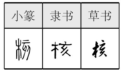 核,形声,从木,亥声,本义读ɡāi,一种树木;又读hé,核果果实中心坚硬的部分(里面含有果仁),由此引申为物体中心、核心、形状像核的东西等,假借为考察、对照等;又读hú,核果果实中心坚硬的部分,用于口语。 |