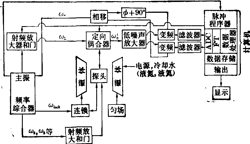 图1 NMR谱参数示例 的宽度。弛豫时间、场的均匀性、化学位移和多重度等都可影响带宽。当带不光滑和不对称时,谱形有明显变化,这时要考虑未分解时的化学位移和多重度。NMR仪原理与实验技术 NMR仪一般由三大部分组成:均匀度达10-9/cm3的磁场部分 (电磁铁或超导磁铁),使自旋能级产生分裂,稳定的强射频发生器,使自旋核产生吸收; 一套检测系统,对共振信号进行接收与记录。 核磁共振仪按所得谱线的宽窄可分为宽谱和高分辨谱两大类。宽谱主要用来测量固体样品; 高分辨谱主要用来测液体样品。 从发射和接收方式上,又有连续波法和脉冲傅里叶变换法之分。前者是用射频连续不断地照射样品,改变磁场或频率,观察自旋核的吸收变化;后者是用等距离脉冲同时激发整个波谱,观察核对脉冲的自由感应衰减(FID)信号,再用数字计算机进行叠加和傅里叶变换,使之成为通常的波谱。后者能比前者提高灵敏度一个数量