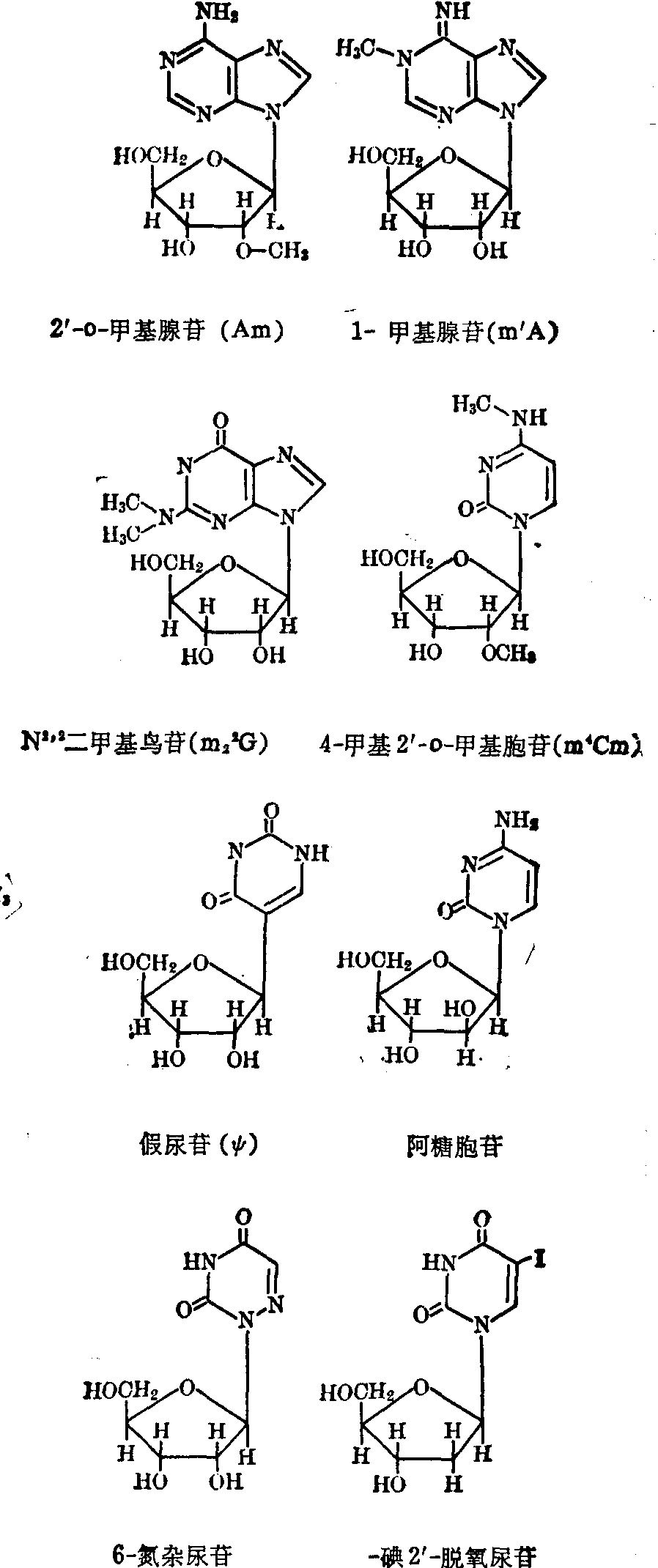 除上述各种核苷外,某些RNA分子中还含有多种少量由稀有碱基形成的稀有核苷,或虽由非稀有碱基形成但结构上比较特殊的稀有核苷(表1)。例如5-核糖尿嘧啶几乎是所有tRNA分子中含量最多的一种稀有核苷,其糖苷键不是N-C原子相连,而是C-C相连,即由D-核糖的第1位碳原子(C-1′) 与尿嘧啶的第5位碳原子(C-5′)相连,故通常称其为假尿嘧啶核苷,或简称假尿苷(ψ)。又如由2′-o-甲基核糖与多种碱基形成的各种2′-o-甲基核糖核苷(Nm),包括2′-o-甲基核糖腺苷(Am)、 表1 RNA分子中的主要稀有核苷