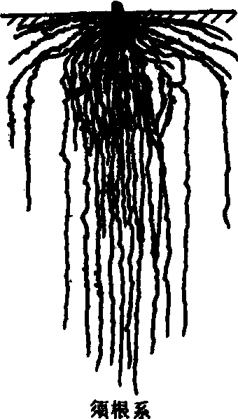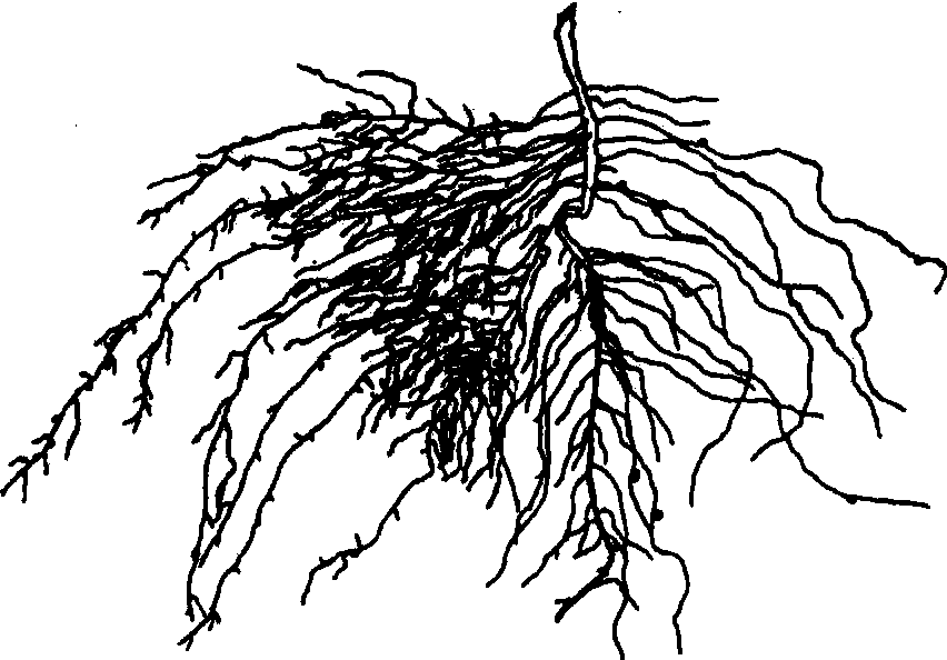 图 1 根系的类型 根冠 由薄壁细胞组成,其外围的细胞排列较疏松,并有粘液。生长在土壤中的根,根冠细胞不断脱落,经常处于更新状态。主要功能是保护根尖的生长点,并有润滑作用。 分生组织 位于根冠后面,长度约1~2毫米。这部分组织的细胞致密,具有很大的细胞核和浓密的原生质,细胞可不断分裂,逐渐形成新细胞。这一部位在生理上最为活跃,也是根系消耗氧气和水分的主要部位。 伸长区 在分生组织之后,长度约2~5毫米,是由分生区产生的新细胞发展而成。其细胞内存在大的液泡,使细胞体积增大,通常长度大于宽度的伸长,因而根可以在土壤中不断延伸,成为根尖深入土层的主要动力。 根毛区 处于伸长区之上,全长可从几毫米到几厘米。这部分细胞不再增加,但最外层细胞向外突出,形成根毛。其长度约为0.5~1.0毫米,平均直径约10微米。细胞质紧贴细胞壁,中央为一大液泡,细胞核多位于根毛的前端。根毛的数目很多,一株小麦根毛的总长度约达10公里。根毛的形成,大大增加了根的吸收面积。因此,根毛在养分吸收上,尤其是对在土壤中移动性小的磷、钾和 一些微量元素的吸收更为重要。根毛数量受环境条件的影响很大,在渍水条件下,根毛一般很少;当土壤干旱或植物体缺水时,首先引起根毛萎蔫、甚至枯死,从而影响植物对养分的吸收。根毛的生存时间很短,通常只有数天到10余天。随着根的生长,根毛不断死亡而更新。 根毛区除了形成根毛外,组织内部已进行分化。表皮以内为皮层细胞,由多层细胞组成,细胞排列疏松,细胞间隙互相贯通,有 一定的通气和物质流通作用。这层细胞内是贮藏营养物质的场所。皮层的内沿有一层排列紧密整齐的细胞,称为内皮层。它的侧壁和上下壁局部增厚并木栓化,呈带状环绕细胞,为溶质和水分进入中柱的屏障。少数双子叶植物的根,其内皮层的细胞壁增厚并木质化,即在原有的基础上覆盖一层木质化纤维层形成厚壁。然而,它们在正对着木质部的细胞壁仍保持薄壁状态,这种细胞称为通道细胞。 内皮层以内的组织称为中柱,包括中柱鞘,木质部和韧皮部组成的维管束和薄壁细胞。其中,中柱鞘位于中柱的最外层,由一层或几层薄壁细胞组成。细胞排列紧密并有分裂能力,条件适宜时能分裂产生侧根、不定芽及形成层等。维管束位于中柱鞘内,包括初生木质部和初生韧皮部。它们的功能,前者是向上运输水分和盐分,后者则主要是向下运输有机物质。在初生木质部和初生韧皮部之间常有几列薄壁细胞。在双子叶植物的根中,这些薄壁细胞能恢复分裂能力,成为形成层的 一部分,产生次生构造。但单子叶植物根中没有形成层,在中柱中央存在未分化的薄壁细胞称为髓,在发育后期,髓细胞可变为厚壁组织,有加强中柱的支持与固定的作用。 成熟区 表层和皮层细胞受到微生物的侵染,以及根分泌物中溶酶的作用,部分组织受到破坏,致使土壤颗粒和微生物侵入皮层细胞以内。这时的内皮层实际起着表皮层的作用,直接受土壤环境的影响。 影响根生长的因素 植物根系的形态特征,首先取决于植物的遗传性,在此基础上还受到土壤物理、化学和生物环境条件的影响。 养分供应 充足的养分通常会促使根系发育良好。其中磷、钾的影响最为明显(图2)。在一侧施肥的试验中,有磷、钾肥的一边,豌豆的 二级侧根明显增加;而无磷、钾肥的一边,不仅根系稀疏,而且几乎无 二级侧根发育。一般养分对根重量的影响不如对根表面积增加的影响显著。