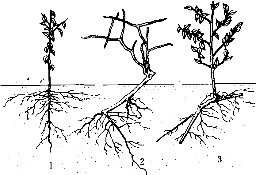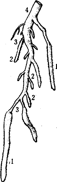 图 1 果树根系的类型 按根系形态分: 由胚根向地生长而成的初生根称主根, 主根上发生的分枝称侧根, 侧根长到一定长度又可分出新的分枝为须根。在土壤中垂直向下生长的根称垂直根, 而沿水平方向生长的根称水平根。 按根系功能、构造分: ❶延长根(生长根)。具初生组织的新生根, 白色, 有强大的分生组织, 生长较快也较长, 可达10~25厘米以上; 由它继续延长能扩大根系的分布范围, 使根系进入新的土层, 并分生侧根; 延长根还具有吸收能力, 随着向前延伸, 其后部逐渐分化次生结构,有的可以成为骨干根。 ❷活跃根。也称营养根, 是白色具初生结构的根, 数量很多, 在根系生长最旺时, 可达总根量的90%以上; 活跃根大部分不能转化为次生组织, 其寿命一般是7~25天,长度为0.1~4毫米, 直径0.3~1毫米;活跃根具有大量根毛,能从土壤中吸收水分和营养物质,并能转化为有机化合物及活性物质,具有高度的生理活性;活跃根的多少对果树营养状况和生长发育的关系极为密切。 ❸过渡根。也是初生组织的根,淡黄色至黄褐色, 由延长根或活跃根转化而成。其中, 小部分发展成为输导根, 大部分则自疏枯死。通常将活跃根及过渡根统称为吸收根。 ❹输导根。由过渡根发展而来, 是次生结构的根, 如继续生长可形成骨干根。输导根将吸收根吸收或转化的水分和营养物质运输到地上部, 同时也把地上部合成的有机营养输送到并具有贮藏功能(图2) ![]() 图 2 果树的根系1.延长根; 2.活跃根;3.过渡根; 4.输导根整个根系, 。根的分布 根系在土壤中分布深度和范围依土壤、树种、砧木等而异。桃、樱桃、梅等分布较浅, 梨、柿、核桃等分布较深,柑橘、苹果等介乎其问。矮化砧的水平根发达, 而乔化砧垂直根发达。多数果树水平根分布层在地表下8~40厘米间,伸展范围一般是冠径的2~3倍。在土层深厚肥沃或经常肥培的果园, 水平根分布距离小, 细根多; 在干旱瘠薄土壤条件下, 根延展远, 而细根少。垂直分布深度取决于土层厚度和土壤理化特性,土质疏松、通气好的土壤, 垂直根发育强大而深; 地下水位高、粘重或有砾石层的土壤, 则限制垂直根向下延伸。一般成年果树的根可深达2~3米或更深, 有时根可沿土壤孔隙向下延伸达10余米。银杏、核桃、栗等具有强大的垂直根, 而多数核果类果树垂直根不发达, 柚、酸橙、甜橙的根系较金柑、枳、柑与橘为深。由胚根延伸的垂直根比茎源根系的垂直根发达。垂直根可以从较深的土层中吸收水分和营养物质, 但吸收量远远少于水平根系。 根的生长 果树根系没有自然休眠, 全年只要具备生长所需的条件, 随时都有新根生长。通常果树根系生长有周期性, 一年中发生的次数、各期的生长强弱、根类的组成, 受树种、品种、树龄、产量、地上生长发育状况等内在因子以及土壤条件和管理措施的