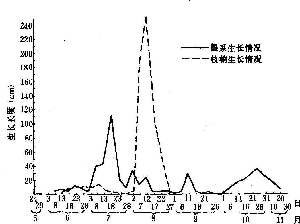 图3 金冠苹果根系的生长动态 多数落叶果树幼年树一年有三次生长高峰,如楸子砧的金冠苹果在山东、河北等地, 第一次生长高峰在3月中旬至4月中旬, 随开花和新梢旺长而转入低潮; 第二次高峰自新梢接近停长至花芽分化前, 一般在6月下旬至7月初出现, 这次是全年发根最多的时期, 随后由于果实迅速发育而转入低潮; 第三次高峰在9月上旬至11月中旬, 此时叶片同化养分向根部回流积累, 其后随着土温降低而进入低潮或停长(图3)。土层较深的果园,下层根有时全年都有少量新根生长,在冬季向阳处或有覆盖条件下,2月后天气回暖时也常有新根生长。成年树由于大量结果的影响, 根的第一次生长高潮多出现在新梢生长转缓时开始; 第二次多在果实采收之后。早春虽有新根生长, 往往形不成明显高潮, 在结果过多的年份, 采后高潮也不明显。 柑橘类果树根系在春梢发生前开始发根, 但量较少, 当春梢大量发生时, 根生长转弱, 大量新梢转绿后, 根系生长开始活跃, 在春梢发生前达到最高峰;第二次和第三次高峰分别在夏梢发生前和秋梢叶转绿后(图4)。