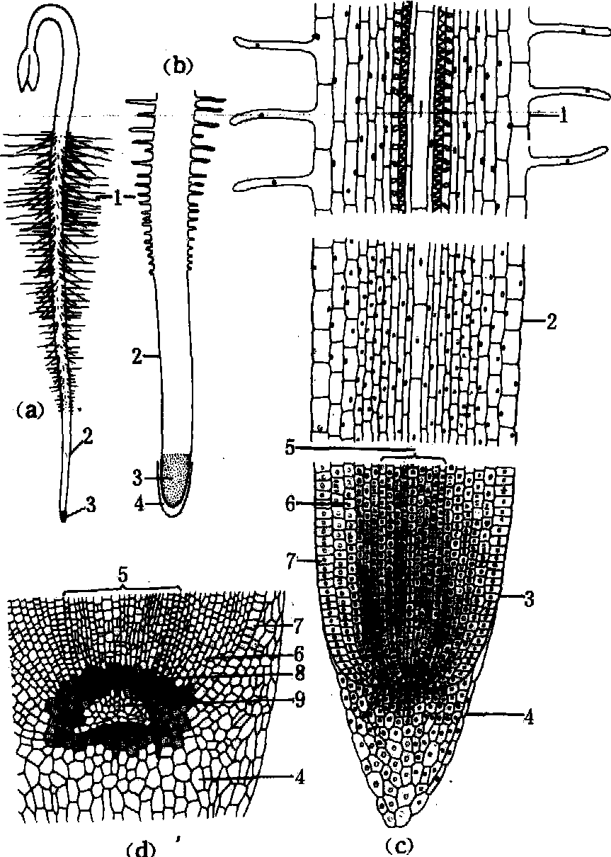 伸长区 此区紧靠分生区之上,细胞逐渐停止分裂,但纵向迅速伸长,成为根尖伸长的主要部分。同时,内部组织已开始分化,向成熟区过渡。 成熟区 细胞停止伸长,分化出表皮、皮层和维管柱3个基本部分。成熟区的表皮有根毛分化,当老根毛死亡后,由邻接伸长区的部分形成新根毛,以继续补充,使有根毛的成熟区经常维持一定的长度,随着根尖的向前伸长,得以顺利地从土壤中吸收养料和水分。 根成熟区的初生结构 表皮 由单层呈砖形的细胞组成,排列紧密,无气孔,许多表皮细胞的外切线壁突出形成管状根毛,增加了根的吸收面积。幼期表皮细胞外壁的角质膜极不发达,后期可形成薄的角质膜,甚至木质化。热带的一些附生被子植物 (如附生兰和附生天南星科植物),它们的气生根表面发育为由多层死细胞所组成的复表皮,称为根被,具有保护、通气或贮水的作用。