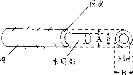 | 释义 | 根皮率见早期鉴定。 根皮率rootphloem ratio砧木根的皮部厚度与根粗的比率。与其生长势呈负相关,作为预测砧木矮化效应指标。根的粗度适中,结果较稳定。其测定方法:从土壤深约20~40 cm处挖出一定粗度的根段,用游标卡尺垂直交叉测定其直径得A、B值,然后剥去根段的皮部,在同一位置垂直交叉测定去皮质部直径得a、b值,按根皮率