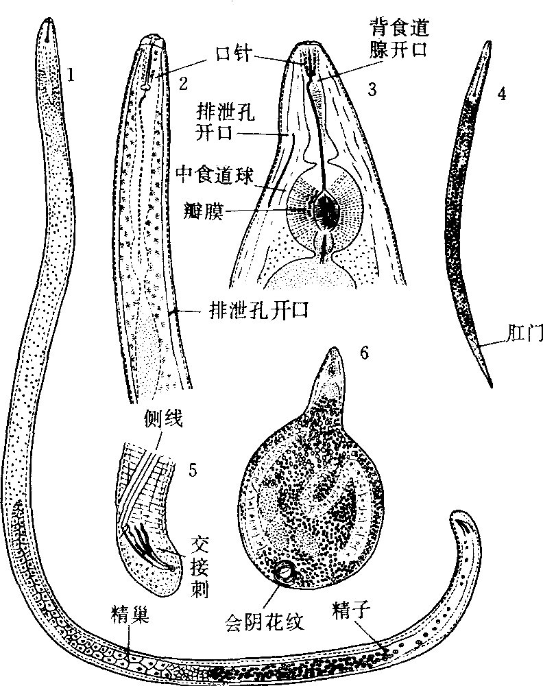 爪哇根结线虫〔M. javanica (Treub) Chitwood〕雌虫会阴花纹具有一个圆而扁平的背弓。侧区具明显的侧线。侧线把线纹分为明显的背面和腹面。无或有很少线纹通过侧线。一些线纹弯向阴门。二龄幼虫体长402~560微米(平均488微米)。染色体数目3n=43~48,雌虫酯酶Rf=0.47、0.55、0.59。该种内未发现有寄主分化现象。它的分布范围比南方根结线虫窄些,包括温带和热带地区,北纬33°至南纬33°的范围。在月降雨量少于5毫米的时间达三个月以上的干旱地区,该种可能是优势种。寄主范围广。 花生根结线虫〔M. arenaria (Neal) Chitwood〕雌虫会阴花纹圆至卵圆形。背弓扁平至圆形。弓上的线纹在侧线处稍分叉,并常在弓上形成肩状突起,背面和腹面的线纹常在侧线处相遇,并呈一个角度。近侧线处的一些线纹分叉、短且不规则。线纹平滑到波浪状,一些可能弯向阴门。花纹也可能有一些向侧面延伸形成一至两个翼的线纹。二龄幼虫体长398~605微米(平均521微米)。有两类染色体,即3n=50~56和2n=34~37,雌虫酯酶Rf=0.54、0.57及Rf=0.50两种类型。该种分为两个小种。花生根结线虫的分布近似南方根结线虫,亦有很广泛的寄主。 北方根结线虫(M.hapla Chitwood) 雌虫会阴花纹形态为近圆形的六边形至稍扁平的卵圆形。背弓常扁平。背、腹线纹相遇成一定的角度,或呈不规则变化。但侧线不明显,有些线纹可向侧面延长形成一或两个翼,线纹平滑至波浪状。尾端区常有刻点。二龄幼虫体长357~517微米。染色体有三类: 单倍体n=17(或16,15,14),二倍体2n=30~31,三倍体3n=43~48。雌虫酯酶Rf=0.50,根据染色体数目不同分为A小种和B小种。北方根结线虫比其它三个常见种的寄主专化性强些。主要分布在较寒冷和热带或亚热带的高海拔地区(1000米以上)。 为害及控制 根结线虫分布广泛,寄主植物多达2000余种,引起全球多种作物的病害。造成极大的经济损失。据统计,南美洲咖啡由根结线虫造成的损失每年估计6~7亿美元,其中巴西在1983年~1984年损失咖啡180万吨,占该国产量的15%以上。此外,田间植物根结线虫常与真菌、细菌同时存在,且相互影响,构成复合侵染。 根结线虫的控制根据不同作物品种、不同线虫种类而定。利用作物品种的抗性十分有效,已在许多国家采用。美国等国家近年来已培育出大豆、烟草、棉花等作物的抗根结线虫病的优良品种。对经济价值较高的作物,可选用杀线虫剂,如克线磷(Nemacur)、克线丹(Rugby)、益舒宝(Mocap)、必速灭(Basamid)、万强(Vydate)、米乐尔(Miral)等进行防治; 对经济价值较低的作物可采用改良土壤、轮作、翻晒土壤等农业措施进行控制。此外,已成功地用淡紫色拟青霉菌(Paecilomyces lilacinus)来控制根结线虫病。菲律宾用此菌做成制剂“Biocon”(商品名),广泛用于实践,取得显著效果。 根结线虫属Meloidogyne垫刃目。通称根结线虫(root-knot nematodes)。两性显著异形。无胞囊阶段。成熟雌虫前端为短颈,其余膨大为球形或长梨形等。角质膜环纹细,会阴区环纹扭曲或断裂成特异的指纹状线纹(通称会阴花纹)。口针长12~15μm。食道垫刃型。双生殖管,卷曲。阴门端生。肛门邻近阴门。无尾。卵产于卵囊中。雄虫线状,发育中有形变。唇区不缢缩,唇盘清晰。口针长18~25μm。食道与雌虫相似。雄性交合刺纤细,一般长25~33μm。缺交合伞。尾极短,端圆。2龄幼虫线状。口针纤细,长不及20μm。尾后部有明显的无色区,尾端窄。3~4龄幼虫无口针。本属有50多个种,分布极广,寄主繁多,是最主要的植物病原线虫,在热带地区危害特别严重。各虫种都以2龄幼虫侵入根系。侵入后幼虫常停留于内皮层或中柱鞘附近,从所诱发的几个寄主巨细胞中固定吸取养料,直至发育成成虫和产卵。病株普遍发生根结(根瘿),地上部衰退。重要虫种有南方根结线虫 〔M. incognita (Kofoid et White )Chitwood〕、爪哇根结线虫〔M. javanica (Treub) Chitwood〕、花生根结线虫〔M.arenaria (Neal) Chitwood〕和北方根结线虫(M. hapla Chitwood),它们都有几百种植物寄主。 |