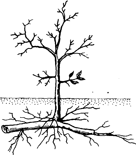 根蘖示意图 根蘖树木根部近地面或露出地面处所生的萌芽条。枣树常用根蘖繁殖幼苗,苹果、梨、樱桃等根部砍伤,也能萌生根蘖以作砧木苗使用。 |