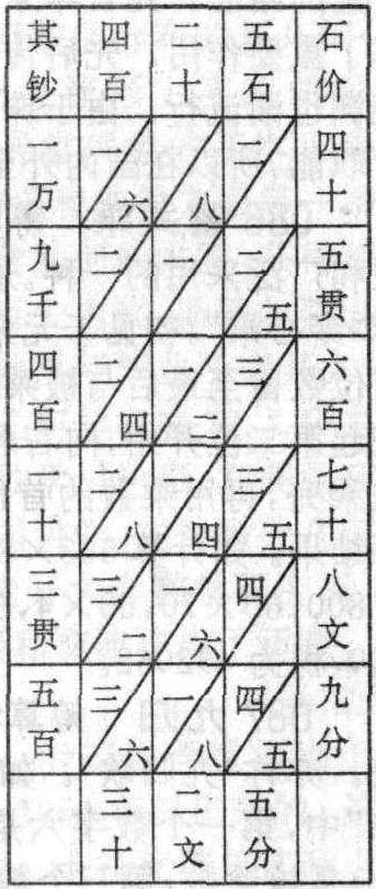 原为流行于阿拉伯的一种古算法。15世纪传入中国。最早的记载见于明吴敬编《九章算法比类大全》(1450)。其方法是先画方格和斜线,记入数字进行计算。因称“格子算”。为与筹算、珠算相区别,吴敬称该法为“写算”。又计算过程中似如织锦,明末程大位在《直指算法统宗》中又称为“铺地锦”。其计算程序和格式如图所示。图中所示的运算是:45贯678文9分×425石=19413贯532文5分。