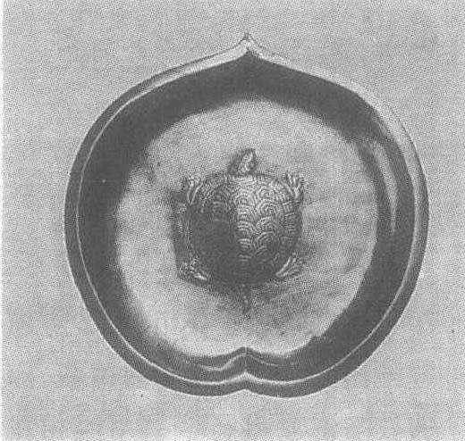 | 释义 | 桃形龟纹银盘 桃形龟纹银盘唐。高1厘米,口径12.3厘米。1970年陕西省西安市南郊何家村窖藏出土。陕西省博物馆藏。此盘呈桃形,盘中间伏卧一龟。相传龟有千年之寿,古人视其为长寿的象征,曰“龟寿”,因此常被用于器物的装饰。