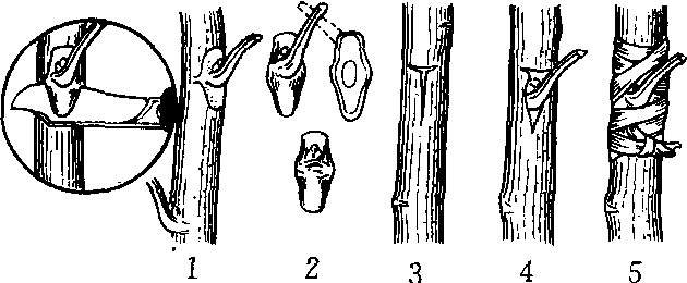 图1“T”形芽接 1.取芽 2.芽片 3.砧木“T”形切口 4.芽片嵌入“T”形切口 5.扎缚