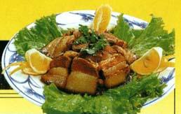 潮州菜菜式 冷 盘 玻璃虾/炸蟹枣、冻蟹、卤水鹅片、四色拼盘。 汤 羹 潮州大鱼翅、鸡炖鲍翅、柠檬炖鸭、紫菜双丸。 海鲜菜 火腿煨螺、蒸焗龙虾/蟹、川椒焗龙虾、明炉鲈鱼、香煎䲝鱼、鲜炒带子、煎蚝烙。 家禽菜 川椒鸽片、碧绿川椒鸡、炸五香鹅、碧绿川椒鸡球。 家畜菜 芥兰沙爹炒牛肉、青椒牛肉丝、味莱炒猪肉、榄菜炒肉碎。 蔬 菜 方鱼芥兰、鸡茸绍菜、北菇扒四宝蔬、干贝蒸菜。 甜 品 冰花官燕、椰汁官燕、银杏芋泥、水晶包、炸油果。
