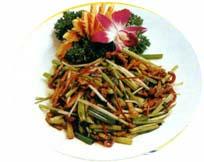 川菜菜式 头 盘 蒜泥白肉、棒棒鸡、陈皮牛肉。 汤 羹 酸辣汤、重庆瑶柱羹、鲗鱼汤、清炖牛尾汤、官燕竹笙汤、肝羔汤。 海鲜菜 鱼香明虾、宫保带子、宫保明虾、脆皮黄鱼片、三鲜锅巴。 家禽菜 樟茶烤鸭/鸽、宫保鸡丁、香酥鸡/鸭、干椒子鸡、家常鸡崧、青椒牛肉丝、回锅肉、蚂蚁上树、牛肚火锅。 蔬 菜 鱼香茄子、麻婆豆腐、干煸四季豆、水晶南瓜。 面 点 担担面、酸辣云吞、银丝卷。 甜 品 杏仁豆腐、豆沙锅饼、蜜瓜西米露。