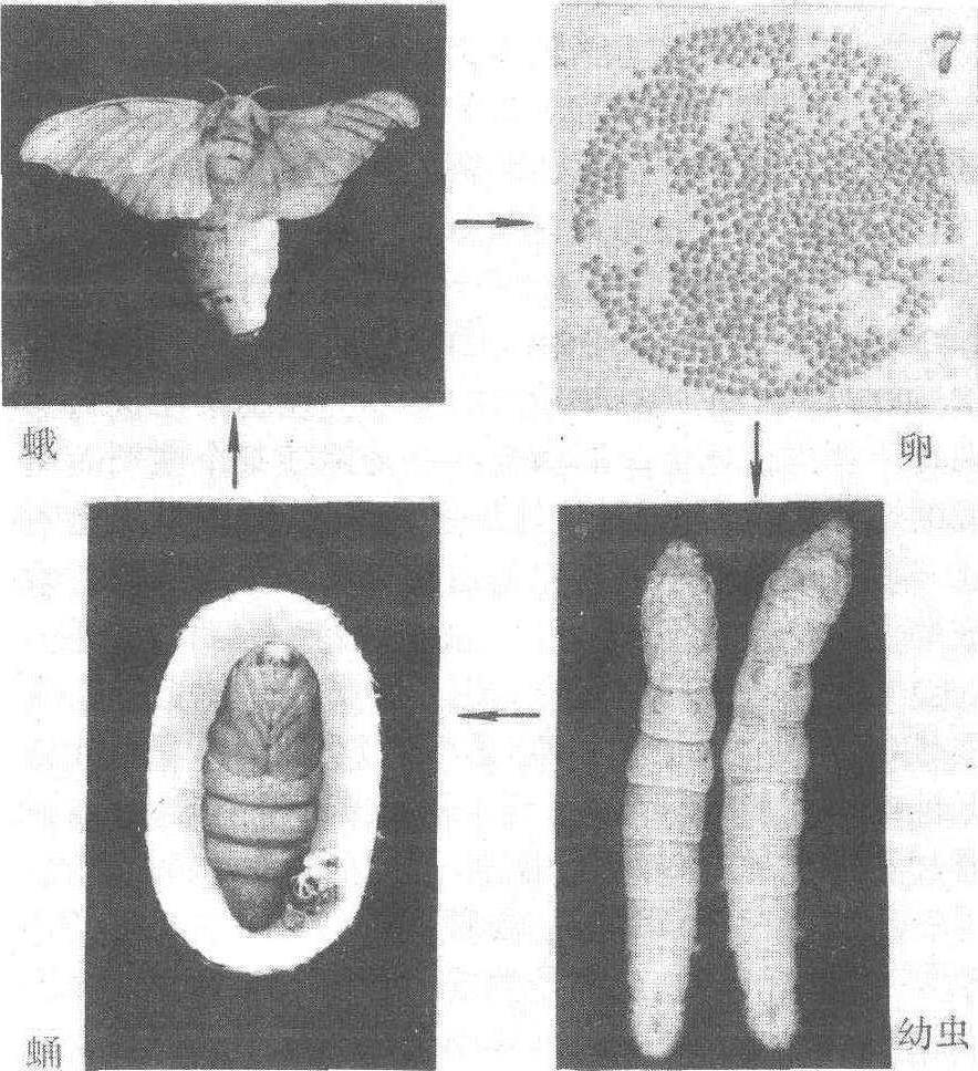 桑蚕发育阶段 桑蚕属寡食性昆虫,除喜食桑叶外,也能吃柘叶、榆叶、鸦葱、蒲公英和莴苣叶等。蚕所必需的营养,有蛋白质、碳水化合物、脂类、维生素、无机盐和水分等。这些在植物叶中均存在,但桑叶中含量丰富,且桑叶生长过程中营养成分的变化,正适合桑蚕生长发育的生理要求,特别是桑叶中存在着促进桑蚕取食的诱食、咬食和吞咽作用的化学物质(见蚕的摄食)。因此,桑叶是蚕最适合的天然食料。桑叶的化学组成也最适于蚕的营养需要,蚕食桑后,幼虫生长迅速,在适温条件下,一头蚕自孵化至吐丝结茧,仅22~26天,约食下桑叶20~25克(合干物5~6.2克),一般经四次眠和蜕皮,至生长极度时,体重约增加1万倍。 吐丝结茧是桑蚕适应环境而生存的一种本能。刚孵化的蚁蚕即能吐丝,以利觅食和防止跌落; 每次眠前也是先吐丝于蚕座,以固定蚕体,便于蜕皮; 熟蚕吐丝结茧,以便在停止取食后,在茧壳保护下安全化蛹和化为成虫。从蚕的生理上说,吐丝结茧是排除它体内过剩的氨基酸,避免氨基酸中毒死亡的一种排泄作用。末龄幼虫的桑叶食下量占整个幼虫期的85%以上,在末龄第3日以前食下的桑叶,主要用于建造蚕体,合成丝物质的丝腺重量不到体重的5%;第4日以后蚕体生长已近极度,对蛋白质的需要量日益减少,随着大量食下桑叶,体内氨基酸大量过剩。蚕在末龄期,即借丝腺的迅速增大和大量合成丝物质来消除体内氨基酸过剩的矛盾; 因此在4~5日内丝腺生长达体重的45~50%,比蚁蚕的丝腺增重约16万倍。如果封闭蚕的吐丝孔,阻止熟蚕吐丝结茧,它就会因氨基酸中毒而死亡。 桑蚕茧可缫丝,丝是珍贵的纺织原料,在军工、交电等方面也有广泛用途。蚕的蛹、蛾和蚕粪也可加以综合利用,是多种化工和医药工业的原料。 桑蚕silkworm,mulberry silkwormBombyx moriL. ,又称家蚕,简称蚕。以桑叶为食料的吐丝结茧的经济昆虫。鳞翅目,蚕蛾科。桑蚕起源于中国,由古代栖息于桑树的原始蚕驯化而来,与中国目前食害桑叶的野桑蚕(Bombyx mandarinaMoorc)同源。桑蚕是完全变态昆虫,一生经过卵、幼虫、蛹、成虫4个形态和功能上完全不同的发育阶段。桑蚕属寡食性,除喜食桑叶外,也能吃柘叶、榆叶、鸦葱、蒲公英和莴苣叶等。幼虫食桑后生长迅速,一头蚕自孵化至吐丝结茧,仅22~26日,约食桑叶20~25 g(桑叶干物重6~6.2 g)。吐丝结茧是桑蚕适应环境的一种本能。熟蚕吐丝结茧后在茧壳保护下安全变态、化蛹和羽化。从生理上说,吐丝是排除蚕体内过剩的氨基酸,避免因血液中氨基酸过多中毒致死的一种排泄作用。桑蚕茧可以缫丝,丝是珍贵的纺织原料,在军工,交电等方面也有广泛用途。蛹、蛾和蚕粪可综合利用,是多种化工和医药工业的原料。 桑蚕昆虫纲鳞翅目蚕蛾科吐丝昆虫。又称家蚕,习称蚕。起源于中国。野生蚕经过人类长期的培育和选择,逐渐被驯化为今天这种具有很高经济价值的桑蚕。以桑叶为食料,生长后期吐丝作茧化蛹。茧可缫丝,主要用于织绸,是优良的纺织原料,在军工、交电等方面用途广泛。蛹和蚕粪还可综合利用。四川养蚕历史悠久,远在4000多年以前,栽桑、养蚕、缫丝、织绸已成为劳动人民生产活动中的重要内容。全省23个市 (地、州) 中的22个市 (地、州) 有蚕业生产,栽桑养蚕的县(市、区) 有160多个,约占全省县 (市、区) 总数的80%。全省主要有六大蚕区: 盆中北部丘陵蚕区、盆南部丘陵蚕区、盆东部平行岭谷蚕区、盆西低山平原蚕区、盆周山地蚕区、攀西亚热带干热河谷蚕区。有蚕种场119个,蚕种冷库14座,每年制种900余万张,蚕种自给有余。多为春、夏、秋、晚秋四季饲养,在北部和高山地区为三季饲养。全年养蚕中,春蚕占35%~40%,夏蚕占20%~25%,秋蚕占30%~35%,晚秋蚕占5%~10%。1978年以来,四川桑蚕生产稳步发展,产茧量每年以10%左右的速度增长,到1994年,产茧21.4万吨,约占全国产茧量的1/3,占世界产茧量的1/5,成为全国乃至世界的原料基地。全省涌现出一大批蚕茧生产主产县,每年产茧5000吨以上的县3个,最高的产茧量达1万吨; 产茧2500吨~5000吨的县16个; 产茧1000吨~2500吨的县45个; 产茧500吨~1000吨的县28个。四川蚕业生产存在着蚕茧单产和质量不高的问题。1994年蚕茧平均单产仅20.5千克,茧丝长924.8米,解舒率51.95%,干毛茧出丝率34.33%,在市场竞争中处于不利地位,极大地影响了全省蚕丝绸行业的整体效益。 桑蚕即“家蚕(幼虫)”。 桑蚕昆虫纲鳞翅目蚕蛾科吐丝昆虫,又称家蚕。起源于中国。蚕有28对染色体。一生经历卵、幼虫、蛹、成虫4个阶段。发育适宜温度20~30℃。幼虫期约23d,蛹期约16d,成虫羽化后3d内产卵,约10d后死亡。一头从孵化到吐丝结茧的蚕食桑叶约20~25 g。 桑蚕 桑蚕种桑养蚕。《汉书·五行志中之下》:“皇后桑蚕以治祭服,共事天地宗庙。” 《诗·豳风·七月》: “女执懿筐,遵彼微行,爱求柔桑。”周代关中即已种桑养蚕。在甘肃嘉峪关市魏晋墓壁画里,有多幅采桑图,大多提篮,也有胸前似张一兜者。还有持弓的桑树保护人。有一幅绘蚕茧和丝束。又有一幅绘绢帛。这是当时当地桑蚕活动的反映。甘肃酒泉丁家闸北凉墓壁画中,在数棵桑树间绘五位采桑女。这样的画面,为当地仅有。1980年,在新疆民丰精绝国遗址发现大量枯死的桑树,并采集到一枚蚕茧,可见当地在汉至晋代已种桑养蚕。《魏书·西域传》载,于阗国“土宜五谷并桑麻”。《大唐西域记》还载有关于桑蚕传入
