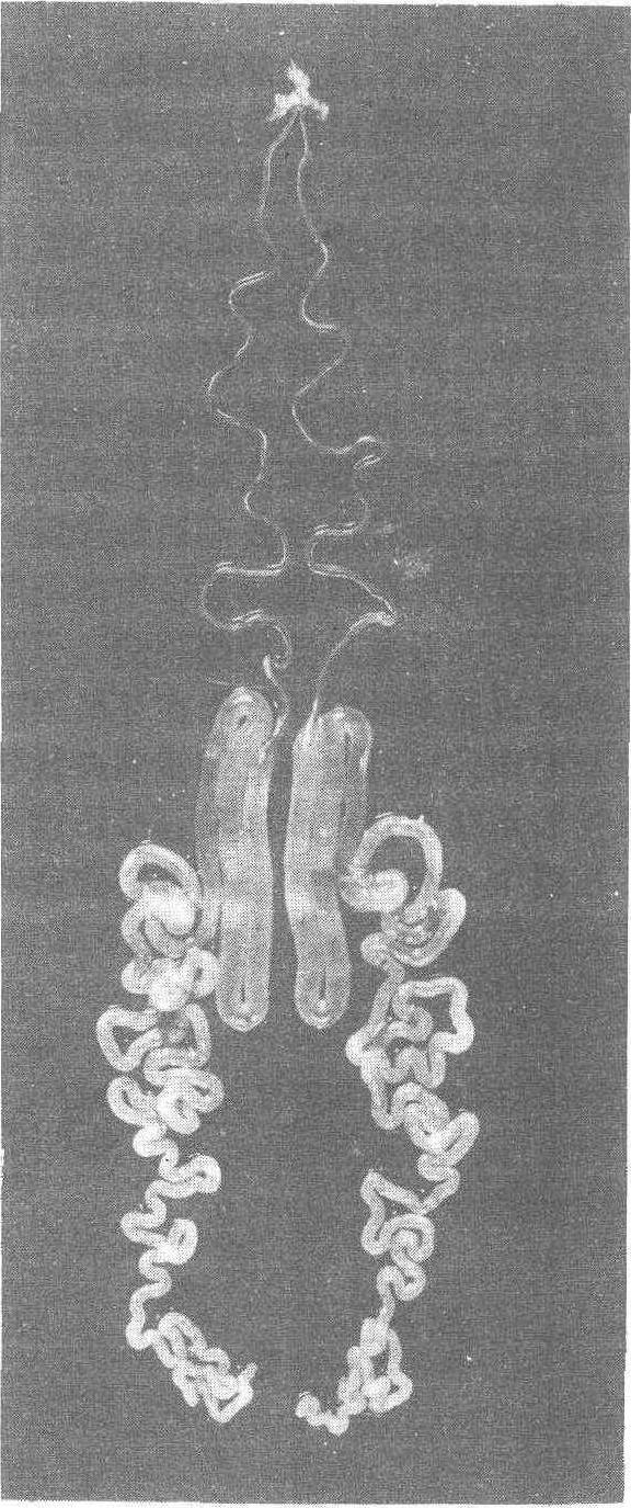| 释义 | 桑蚕丝腺silk gland of mulberry silk-worm桑蚕分泌丝物质的器官,由外胚层生成的下唇腺变形而成。丝腺是一对半透明多屈曲的大形管状器官,配置在消化管的腹面两侧,在5龄末期,其体积仅次于消化管。从位置和机能上可分为吐丝管、前部丝腺、中部丝腺和后部丝腺(图1)。