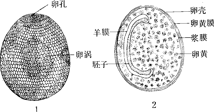 成虫的内部生殖器特别发达,占据着腹腔容积的绝大部分。雌蛾的卵巢和幼虫时显著不同,幼虫时卵巢内的4条卵巢管,在5龄开始迅速伸长,化蛹后挤破卵巢外膜。游离于腹腔内,8条卵巢管每条内约含有蚕卵50~90粒,一只母蛾共计生卵400~720粒。幼虫的生殖导管发育成了成虫的侧输卵管和中输卵管,前生殖芽发育成交配囊、受精囊和前庭,后生殖芽发育成了产卵管和粘液腺。雄蛾的睾丸与幼虫基本相似,外观上发达呈球形,睾丸内4个睾丸胞均充满着精子束,内含许多成熟的精子。幼虫期的生殖导管发育成了输精管,生殖芽(赫氏腺)发育形成了贮精囊、射精囊、射精管、附腺和外生殖器的阳茎(见蚕的生殖附图1、2)。 |