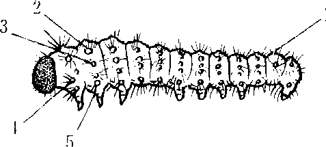 幼虫 蚕体呈长圆筒形,由头部和体部构成,头部略成半球形,位于最前方,外包暗褐色骨化头颅,其上密生刚毛,体部可分为胸部和腹部,胸部由3个环节、腹部由10个环节构成,在头部和前胸背面有稍呈三角形的颈膜相连接,除胸部背面以及腹部的第9和第10环节之间外,其他各环节之间都有节间膜,由于颈膜和节间膜极为柔软,因此头部和这些环节可自由转动、伸缩。在第8腹节背面中央有个锥形的肉质突起,称尾角。在第1胸节及第1~8腹节的各环节两侧,各有一对黑褐色椭圆形气门,共9对,这是呼吸器官的开口(图2)。