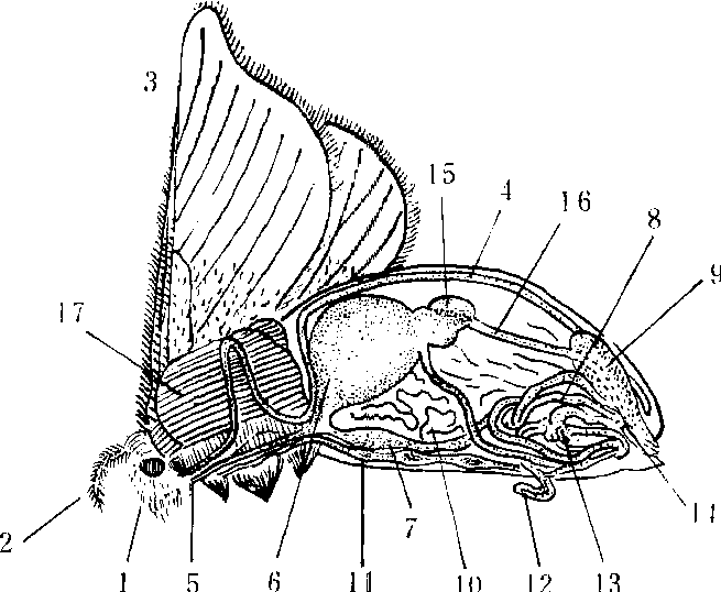蛹期主要内部器官的形态与幼虫期有显著不同,雌雄之间也有差异,同时由于蛹是变态期,内部组织器官的形态逐日都有变化,至蛹的后期,在蛹皮内基本上已是成虫的形态。 成虫(蚕蛾) 成虫也分头、胸、腹3部分。除节间膜外全身遍被白色鳞片,头部很小,两侧有一对大形的双栉状触角和半球形的复眼。触角雄比雌大,由30~40小节构成,是蚕蛾重要的嗅觉和触觉器官。复眼黑色或红色等,每只复眼约由3,000只六角形的小眼紧密排列而成,是视觉器官,复眼色素与卵色相同也是色氨酸的代谢产物。口器在左右复眼之间,也由上唇、上腭、下腭、下唇4部分组成,但已极度退化,仅留痕迹,只下腭发育成一对白色的囊状体,化蛾时分泌溶茧酶,用以溶解茧层丝胶,羽化后即萎缩。胸部分前胸、中胸、后胸3节,前胸最小,中胸最大,各胸节腹面均有一对胸足,中胸和后胸背面两侧各生一对翅,前翅三角形稍大,后翅呈圆形略小,腹部环节数因雌雄而有不同,雌蛾7个环节,雄蛾8个环节,其余环节发育成了蚕蛾的外部生殖器。与蛹期一样,前胸和第1~7腹节两侧各有一对气门。 雌蛾的外生殖器,由幼虫的第8、9、10三个环节变成,其中第9、10两节愈合成淡褐色半球状的侧唇,其上密生感觉毛,侧唇中央有一条纵沟,中有两个孔,上方的是肛门,下方的是产卵孔。第8腹节背板变成中央狭两侧宽的骨板,第8腹节腹板形成黑褐色而坚硬的锯齿板。在锯齿板和第7腹节腹板间的腹中线上有交配孔。侧唇和锯齿板之间的两侧,有一对由节间膜演变而成的淡黄色囊状体,称侧胞或诱惑腺。羽化后,向侧方突出并分泌一种挥发性物质—桑蚕醇,用以引诱雄蛾。雄蛾的外生殖器由幼虫的第9、10两腹节变形而成,其中第10腹节的背板形成黑褐色骨质的钩形突,腹板变成“U”形骨片的匙形突,钩形突和匙形突之间膜质部的中央有肛门。第9腹节的背板中央凹陷成两块菱形骨片,称菱形突。腹板中央变成骨质环,称基腹弧。中央是阳茎,阳茎是骨质管状体,先端呈三角形,先端腹面有射精孔,射精孔两侧有一对膜质瘤状体,其上生有许多感觉毛,阳茎后半部被白色膜质的阳茎鞘包裹。基腹弧两侧有一对大形的骨质抱器,也是由第9腹节腹板形成,交配时用以钩住雌蛾的锯齿板。 成虫的内部器官在形态上也与幼虫有显著差异。成虫由于不再摄食,消化管已退化并改司其他生理作用,前肠变得细长,后端形成囊状体向背方突出,此称嗉囊或吸胃。其中积贮着无色透明的碱性液体,羽化时吐出,与下腭分泌的溶茧酶一起湿润和溶解茧层丝胶。中肠萎缩成扁平的椭圆形体,上有许多横皱。后肠成细长管,后端膨大成囊状,称直肠囊。马氏管开口于后肠前端,两侧各分出3条细管游离于腹腔内,吸取蛹期的代谢废物并转贮于直肠囊中,化蛾后排出体外,即蛾尿。背管在胸部有两次向腹面弯曲,至第7腹节背面以盲管终了。神经系和气管的分布与幼虫略同,但成虫神经节较幼虫期少,气管变成银白色,脂肪体变成丝状,胸部肌肉显著发达(图9、图10)。
