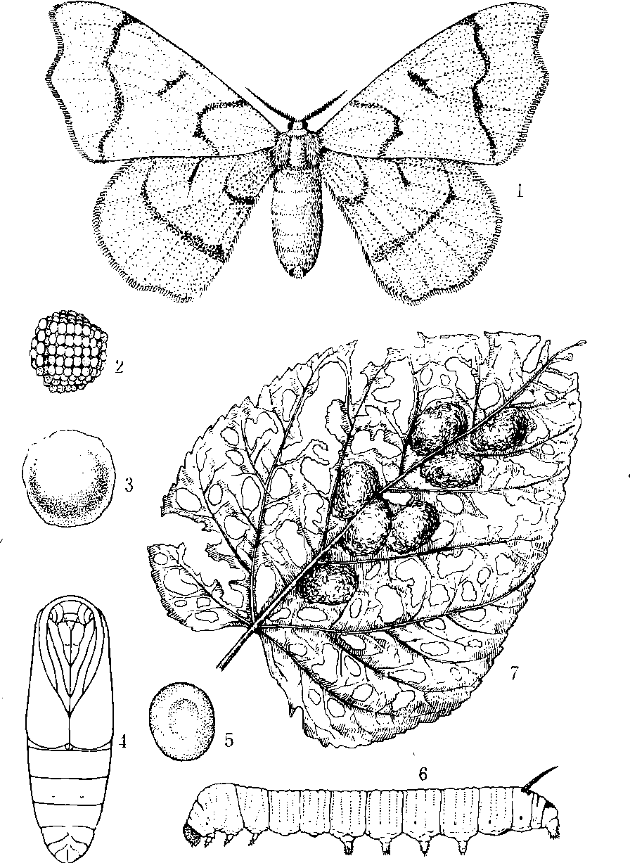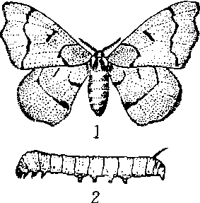 桑蟥 1.雌成虫 2. 幼虫 桑蟥俗称“白蚕”、“洋白蚕”、“松花蚕”、“野蚕”、“蟥虫”等。鳞翅目,家蚕蛾科。为害桑叶的害虫之一。有一化、二化、三化性种类,卵态越冬。幼虫期最大体长约24毫米,头黑色,胸腹部乳白色。初龄幼虫体上有白粉,3次蜕皮后,粉变豆黄色,8腹节背面有一黑色臀角。防治方法:1.人工捏除幼虫、蛹,冬季刮除桑枝干上的有盖卵块。2.苗木检查消灭蟥卵。将接穗苗木放入90%晶体敌百虫2000倍液中浸渍1—2分钟。 |