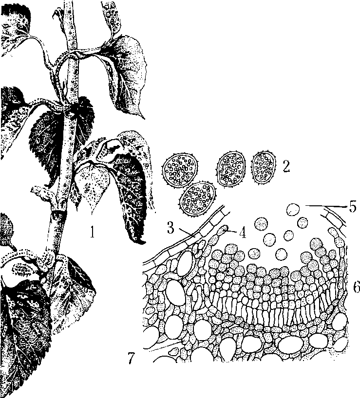病原 桑赤锈病的病原菌为桑锈孢锈菌,锈菌目,半知锈菌科,锈孢锈属,学名为Aecidium mori(Barcl)Diet。本病原菌是一种简单的锈菌,只产生锈子器和锈孢子,锈孢子发芽侵入桑绿色组织,在表皮下形成菌丝,并生出吸胞插入细胞内摄取养分。吸胞长7~15微米,大多呈圆筒形,有时尖端呈螺旋状,也有分叉。锈子器球形直径约150微米,最大可达400微米左右。周围有一层护膜,成熟后隆起突破寄主表皮组织。锈子器内底部有圆形担子梗,无色,顶生连锁状锈孢子。新生幼小的锈孢子为无色、圆形,逐渐呈橙黄色,成熟的锈孢子具厚膜,表面附有许多微小突起。锈孢子长宽为11~15×13~18微米,当锈子器突破表皮后,发育呈钟状,锈孢子即从锈子器破口而出。 侵染 桑赤锈病以菌丝体在桑树枝条内越冬。中国南方桑树全年有绿叶,具备以锈子器和锈孢子越冬条件。长江流域因锈孢子抗寒力弱,一般不能越冬。枝条上病斑大多数已经坏死,已无致病性,只有与枝迹十分接近以及叶痕、芽鳞上的病斑有致病作用。这些病斑内的菌丝侵入桑芽,到次年随桑芽萌动而发育,使桑芽发病。一般在4月上旬至4月下旬 (广东气温较暖,则在2月份) 初次侵染发病,所形成的锈孢子又可飞散到新梢、叶片、花椹而再次侵染,条件适宜时,可不断引起再侵染。病菌锈孢子侵染发芽温度为5~36℃,最适温度13~28℃,相对湿度93%。此病从春季桑芽萌发至秋季连续发生。温度高于30℃,湿度低于80%,则发病抑制,或骤然停顿。中国南方温暖地区,全年每个季节都有发病,而以5~6月和9~10月为发病高峰期。长江流域因秋旱影响,主要在春夏季4~6月发生严重,黄河流域雨季较迟,发病期在4~10月之间,雨季特别严重,不同桑树品种抗病力有差异。广东的伦教40号比普通荆桑容易感染发病,山东的鲁桑品种如: 大鸡冠、小鸡冠、黑鲁桑和大白条等品种也易发病,而黄鲁桑和湖桑32号则比较抗病,但湖桑32号在江苏、浙江等地都发病严重。江南桑园新老树混栽、春伐、夏伐兼行的北方间作桑园在收获桑叶时不伐条的,山东留枝留芽收获的,山西出扦法收获的,广东留大树尾收获的,都在桑树生长期间,留存绿叶,给病原侵染留有过渡存活的机会,均易发病。 病症 病原菌侵入桑树的幼芽、嫩叶、新梢以及花椹等绿色组织,发病后病芽局部肥厚,弯曲呈畸形,产生橙黄色病斑,生长停顿,变焦脱落。叶部受害时,病斑发生在正背两面,在叶面的多呈散发性点状病斑,在叶背的多沿叶脉蔓延呈网条状病斑。新梢上的病斑,初黄色椭圆形,后老化变暗褐色的坏死斑,凹陷,病斑部的木质变黑,易折损,常导致病斑部以上枝条产生枯梢现象。病斑上初时带有光泽透绿细小圆点,逐渐扩大隆起如小泡状(青泡),以后青泡变黄,突破表皮,产生橙黄色病斑(黄泡),从病斑上散出橙黄色粉状物后老化,变焦褐色(焦泡)。 防治 剥除初次侵染病芽,彻底夏伐有消除病源,控制再次侵染蔓延的效果; 在初发病桑园用25%可湿性粉锈宁粉剂1000倍液,喷布2~3次,喷药间距20天左右,可控制发病。 桑赤锈病mulberry red rust又称赤粉病、金桑。分布于江苏、浙江、四川、广东、广西、云南、山东、山西、福建、安徽、江西、河北、陕西、甘肃、辽宁、新疆、台湾等省区的蚕区;印度、日本和朝鲜半岛也有分布。叶片被害后,肥厚隆起,呈橙黄色,并沿叶脉、叶柄方向蔓延;叶柄、新梢被害后,弯曲成畸形,布满橙黄色粉末。病原Aecidium mori (Barcl.)Diet.为担子菌亚门冬孢菌纲锈菌目不完全锈菌科锈孢锈菌属的真菌,以菌丝体在病枝芽中越冬。可在早春剥除病芽;用25%粉锈宁1 000倍或40%拌种灵300倍液喷。 桑赤锈病俗称“金桑”、“金叶”、“黄疽”、“赤粉病”。桑真菌病类。本病主要为害嫩叶、叶片、叶柄和新梢。最初病叶出现绿色针尖状斑点,后扩大隆起呈小泡泡状,终变黄色,金黄色粉未状锈孢子突破叶皮表层散出,故得名“金桑”。病害部位往往肥肿,弯曲呈畸形,新梢较久病斑变黑褐色而凹陷。低温多湿是发病的重要诱因,春夏之交易发此病。防治方法:1.加强桑园管理作好排水工作。2.消灭病原。患病初期,即时去除病芽、病叶、病梢。3.药物防治,用20%萎锈灵乳剂300—500倍液,25%粉锈宁1000倍液,40%拌种灵300倍液在发病初期喷雾防治;用波美0.4—2.5度石灰硫磺合剂加0.2%硫酸铁铵混合液杀灭叶表层病原。 |