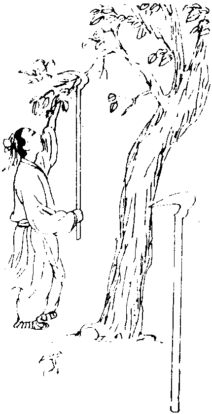 採桑用具。爲一長柄鉤。用以鉤取遠處枝葉。元·王禎《農書》卷二十一:“桑鉤,採桑具也。凡桑者欲得遠揚枝葉,引近就摘,故用鉤木以代臂指扳援之勞。昔后妃世婦以下親蠶,皆用筐鉤採桑。唐肅宗上元初獲定國寳十三,内有採桑鉤一,以此知古之採桑皆用鉤也。然北俗伐桑而少採,南人採桑而少伐。歲歲伐之,則樹脉易衰:久久採之,則枝條多結。欲南北隨宜採斫互用,則桑斧桑鉤各有所施,故兩及之不致偏廢。梅聖俞詩云:‘長鉤板桑枝,短鉤挂桑籠。南陌露氣寒,東方日光動。少婦首且笄,幼女角已總。競用採葉歸,曾非事梳櫳。’”