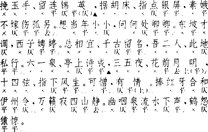梁州第七 梁州第七张可久 “长天落彩霞”套  全曲十八句:7 ▲,7 △,7 △。4,4 △。4,4 △。7 △,7 △。7 ▲,7 △,7 △。2 △,2 △,7 △,5 △,7 △,4 △。词式整齐,特多对句。首二句须对。第三句单行。第四、五句,第六、七句,均须对。第八、九句,以不对为宜。第十、十一、十二句须作鼎足对。两二字句可合为四字一句,如关汉卿《赠朱帘秀》套“凌波殿前”。张养浩《咏喜雨》套,全曲只作六句,为首三句,第十五句,末二句,共减去十二句,实为减句格特例。套数次牌。亦简称〔梁州〕。乔吉“鱼尾红残”套一反常例,以〔梁州第七〕为首牌,而以〔一枝花〕为次牌,未见其他作者用。又有以〔梁州第七〕为首牌,连用幺篇,而不用〔一枝花〕,见商政叔“暖律回春”套,此为初期体式,仿作者仅见朱庭玉“腹内包藏”套。与南〔梁州序〕一名〔梁州第七〕不同。 ☚ 一枝花 隔尾 ☛ 梁州第七 梁州第七曲牌名。联在 〔一枝花〕后又简称〔梁州〕。属北曲南吕宫。字数定格及韵式据清·周祥钰《九宫大成谱》正格为七、七、七、四、四、四、四、七、七、七、七、七、二、二、七、六、七、四(十八句)。该调字句不拘,可以增损。用于套曲中,一般接在南曲〔一枝花〕 之后。如 〔长生殿·弹词》中李龟年所唱“想当日奏清歌趋承金殿”一段。又南曲 〔梁州序〕有时也称作〔梁州第七〕。 ☚ 一枝花 隔尾 ☛ 00002517 |
