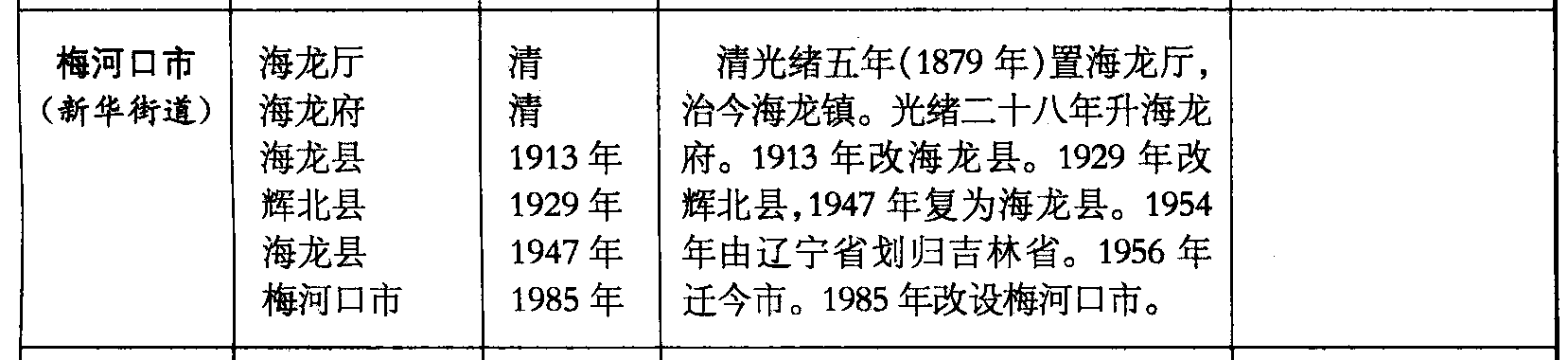梅河口市(新华街道)海龙厅海龙府海龙县辉北县海龙县梅河口市清清1913年1929年1947年1985年清光绪五年(1879年)置海龙厅,治今海龙镇。光绪二十八年升海龙府。1913年改海龙县。1929年改辉北县,1947年复为海龙县。1954年由辽宁省划归吉林省。1956年迁今市。1985年改设梅河口市。