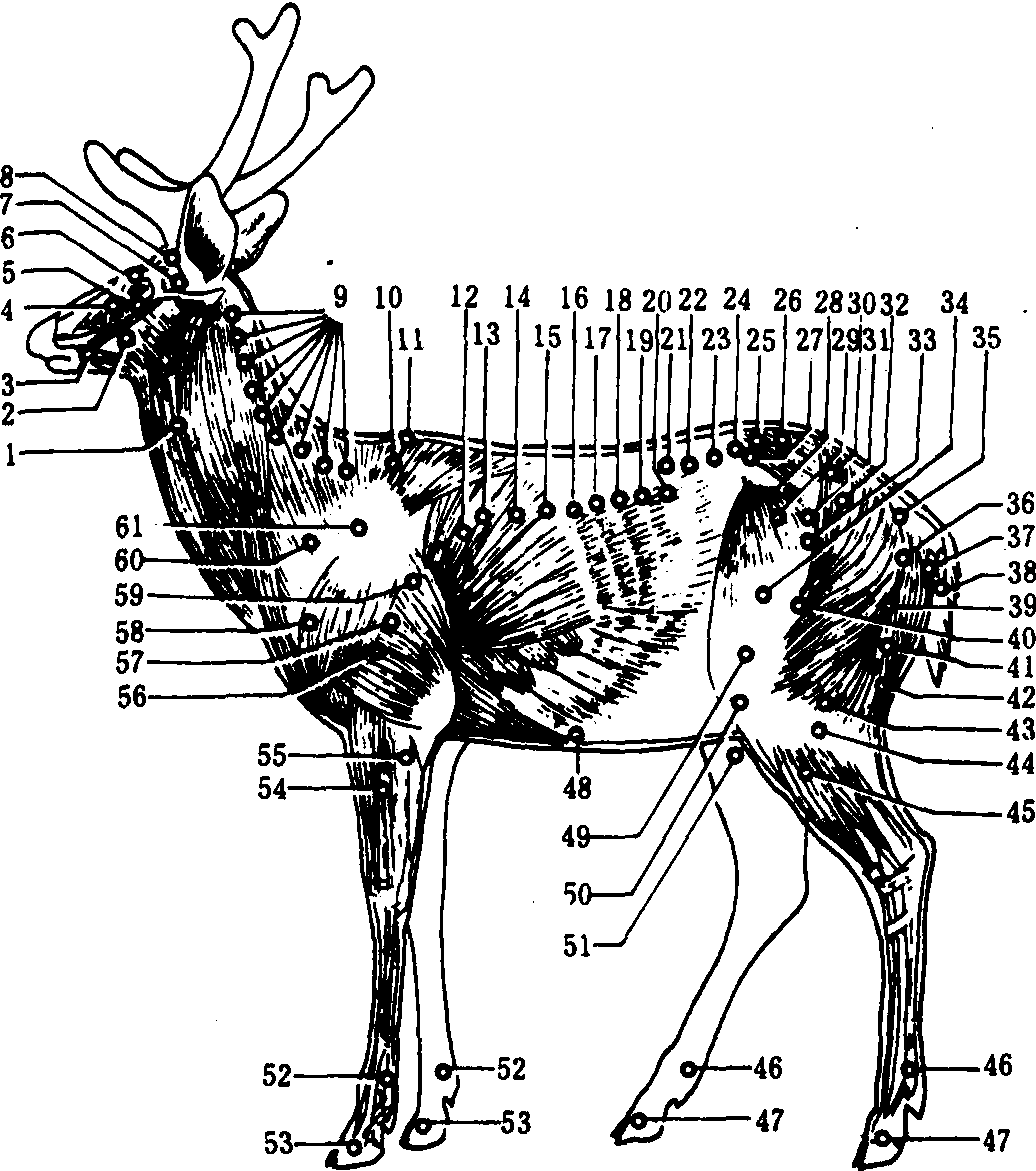 图 1 梅花鹿肌肉及穴位 膊尖(bojian) 肩胛软骨与肩胛骨前角结合处,左右侧各一穴。圆利针沿肩胛骨内缘向后下方刺入3~5厘米。主治闪伤跛行、前肢风湿。 膊栏(bolan) 肩胛软骨与肩胛后角结合处,左右侧各一穴。圆利针沿肩胛骨内侧向肩峰方向斜刺3~5厘米。主治闪伤跛行、前肢风湿。 肺门(feimen) 肩胛骨前缘, 膊尖穴下方7厘米处,左右侧各一穴。圆利针向肘突方向刺入3~5厘米。主治前肢风湿、肩胛上神经麻痹。 肺攀(feipan) 肩胛骨后缘, 膊栏穴下方7厘米处,左右侧各一穴。圆利针向肩峰方向斜刺3~5厘米。主治前肢风湿、肩胛上神经麻痹。 抢风(qiangfeng) 肩关节后方,三角肌后缘, 臂三头肌长头与外头之间的凹陷中, 左右侧各一穴。圆利针直刺3~5厘米。主治闪伤、前肢风湿。 冲天(chongtian) 抢风穴后上方约4厘米,三角肌与臂三头肌长头之间的凹陷处,左右侧各一穴。圆利针直刺3~5厘米。主治前肢风湿、关节肿痛。 胸堂(xiongtang) 胸前两侧,桡骨上端水平位处的臂皮下静脉上,左右侧各一穴。中宽针沿血管刺入0.5厘米,出血。主治肩肘关节肿痛、中暑。 肩井(jianjing) 肩关节外侧,臂骨大结节上缘, 肩峰直下方的凹陷处, 左右侧各一穴。圆利针向内下方斜刺约3厘米。主治前肢风湿病、肩关节肿痛。 乘重(chengzhong) 桡骨外侧韧带结节下方2厘米的前臂外侧沟内, 左右肢各一穴。圆利针直刺约3厘米。主治前肢风湿病、肘腕关节肿痛。 前三里(qiansanli) 乘重穴下方4厘米的桡沟内,左右肢各一穴。圆利针直刺约3厘米。主治前肢风湿病、肘腕关节肿痛。 缠腕(chanwan) 球节部, 掌(跖)骨下端的指(趾)内外侧静脉上, 每肢二穴, 共八穴。小宽针点刺放血。主治球节扭伤、蹄头肿痛。 蹄头(titou) 蹄冠上缘背侧向远轴侧旁开1厘米处, 每肢二穴, 共八穴。小宽针点刺放血。主治中暑、感冒、蹄头肿痛。 鬐甲(qijia) 第四胸椎棘突前缘的背中线上, 一穴。圆利针斜向前下方刺入约10厘米。主治气喘、感冒。 大椎(dazhui) 颈基正中, 冈上肌前缘4厘米,左右侧各一穴。圆利针直刺约10厘米。主治感冒、中暑。 断血(duanxue) 第十二与第十三胸椎、第十三与第一腰椎、第一与第二腰椎棘突之间的凹陷处各一穴, 共三穴, 依次为断血一、断血二、断血三。圆利针直刺约4厘米。主治尿血、便血。 命门(mingmen) 第二与第三腰椎棘突之间凹陷处, 一穴。圆利针直刺约4厘米。主治尿闭、肾炎、风湿症。 安肾(anshen) 第三与第四腰椎棘突之间的凹陷处, 一穴。圆利针直刺约4厘米。主治尿闭、肾炎、风湿症。 阳关(yangguan) 第四与第五腰椎棘突之间的凹陷处,一穴。圆利针直刺约4厘米。主治腰胯风湿病。 大肠俞(dachangshu) 倒数第一肋间的髂肋肌沟内,左右侧各一穴。圆利针直刺约3厘米。主治消化不良、肠黄、臌气。 胃俞(weishu) 倒数第二肋间的髂肋肌沟内,左右侧各一穴。圆利针直刺约3厘米。主治消化不良、肠黄。 脾俞(pishu) 倒数第三肋间的髂肋肌沟内,左右侧各一穴。圆利针直刺约3厘米。主治消化不良、瘤胃积食、臌气。 肝俞(ganshu) 倒数第四肋间的髂肋肌沟内,左右侧各一穴,圆利针直刺约3厘米。主治眼病、黄疸。 肺俞(feishu) 倒数第五肋间的髂肋肌沟内,左右侧各一穴。圆利针直刺约3厘米。主治咳嗽、气喘。