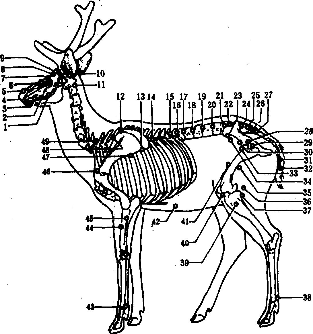 图2 梅花鹿骨胳及穴位 关元俞(guanyuanshu) 第十三肋骨后缘的髂肋肌沟内,左右侧各一穴。圆利针直刺约3厘米。主治瘤胃积食、前胃弛缓。 小肠俞(xiaochangshu) 第一、二腰椎横突顶端向外延长线之间的髂肋肌沟内,左右侧各一穴。圆利针直刺约3厘米。主治消化不良、腹泻、臌气。 膀胱俞(pangguangshu) 第二、三腰椎横突游离端向外延长线之间的髂肋肌沟内,左右侧各一穴。圆利针直刺约3厘米。主治尿闭、肾炎。 滴明(diming) 乳井后缘,剑状软骨游离端后方4厘米,腹白线垂直旁开4厘米的腹皮下静脉上,左右侧各一穴。中宽针点刺放血。主治尿闭、臌气。 夹脊(jiaji) 胸腰部背中线两侧平行排列的两行梅花斑上,从第一胸椎到最后腰椎棘突旁开2厘米,每一椎骨后缘显示一对穴位。左右侧各19穴,共19对。圆利针直刺5~10厘米。主治背腰风湿病。 百会(baihui) 最后腰椎与第一荐椎棘突之间的凹陷处,一穴。圆利针直刺约5厘米。主治腰胯闪伤、背腰风湿病、后躯麻痹。 肾俞(shenshu) 百会穴旁开4厘米,左右侧各一穴。圆利针直刺约4厘米。主治腰胯风湿、腰背闪伤。 肾棚(shenpeng) 肾俞穴前方约4厘米,距背中线4厘米处,左右侧各一穴。圆利针直刺约6厘米。主治腰胯闪伤、腰胯风湿症。 腰后(yaohou) 肾棚穴前方约4厘米,距背中线4厘米处,左右侧各一穴。圆利针直刺约6厘米。主治腰部风湿。 腰中(yaozhong) 腰后穴前方4厘米,距背中线4厘米处,左右侧各一穴。圆利针直刺约6厘米。主治腰部风湿。 腰前(yaoqian) 腰中穴前方4厘米,距背中线4厘米处,圆利针直刺6厘米。主治腰部风湿。 肾角(shenjiiao) 位于肾俞穴后方4厘米,距背中线4厘米,左右侧各一穴。圆利针直刺约5厘米。主治腰胯风湿病、腰胯闪伤。 八窖(bajiao) 荐椎棘突间外侧2厘米,左右侧各四穴,共八穴,故名八窖(从前向后,依次为上窖、次窖、中窖、下窖)。圆利针直刺约3厘米。主治后躯风湿病。 后海(houhai) 肛门上方,尾根下方的凹陷中,一穴。圆利针向前方刺入约10厘米。主治腹泻、便秘、脱肛。 尾本(weiben) 尾部腹侧正中,距尾根2厘米处,一穴。以小宽针点刺放血。主治闪伤腰胯、腰胯风湿病、热性病。 尾尖(weijian) 尾的尖端处,一穴。以小宽针直刺1厘米,出血。主治中暑、感冒、热性病。 巴山(bashan) 位于百会穴与股骨大转子连线中点, 左右侧各一穴。圆利针直刺约6厘米。主治后躯风湿病、股神经及坐骨神经麻痹。 路股(lugu) 位于巴山穴后下方4厘米, 荐结节与股骨大转子连线中点, 左右侧各一穴。圆利针直刺约6厘米。主治后躯风湿病、股神经及坐骨神经麻痹。 雁翅(yanchi) 髋结节前角与肾棚穴连线中点,左右侧各一穴。圆利针直刺约5厘米。主治后肢风湿病。 丹田(dantian) 髋结节后下方4厘米处,左右侧各一穴。圆利针直刺约4厘米。主治后肢风湿。 居髎(juliao) 髋结节后下缘的凹陷处, 左右侧各一穴。圆利针直刺约4厘米。主治后肢风湿、跛行。 环跳(huantiao) 股骨大转子前方4厘米, 髋臼窝前缘, 左右侧各一穴。圆利针直刺约5厘米。主治局部肿痛、后肢风湿。 环中(huanzhong) 股骨大转子前上方4厘米;髋结节与坐骨结节连线中点处, 左右侧各一穴。圆利针直刺约5厘米。主治后肢跛行及风湿病。 环后(huanhou) 位于环中穴后下方, 股骨大转子前上缘, 左右侧各一穴。圆利针直刺约6厘米。主治后肢跛行及风湿症。 大胯(dakua) 股骨大转子前下方, 左右侧各一穴。圆利针直刺约6厘米。主治后肢风湿、闪伤腰胯。 小胯(xiaokua) 股骨中部后缘凹陷处, 左右侧各一穴。圆利针直刺约6厘米。主治腰胯闪伤、后肢风湿。 后伏兔(houfutu) 股骨中部前缘, 左右侧各一穴。圆利针直刺约8厘米。主治后肢风湿、膝关节肿痛。 阴市(yinshi) 膝关节上方, 膝盖骨外上缘的凹陷处, 左右肢各一穴。圆利针直刺约5厘米。主治膝关节肿痛、后肢风湿。 阳陵(yangling) 膝关节后方,胫骨外髁后上缘,左右肢各一穴。圆利针直刺约5厘米。主治局部肿痛、后肢风湿。 掠草(luecao) 膝关节前面, 膝外、中直韧带之间的凹陷处,左右肢各一穴。圆利针直刺约2厘米。主治局部肿痛、后肢风湿。 丰隆(fenglong) 胫骨外髁后下缘的凹陷处, 左右肢各一穴。圆利针直刺约5厘米。主治局部肿痛、后肢风湿。 后三里(housanli) 位于掠草穴后下方6厘米的腓沟内, 左右肢各一穴。圆利针直刺约4厘米。主治消化不良、膝、跗关节肿痛。 肾堂(shentang) 膝关节内侧面的隐静脉上, 左右肢各一穴。大(中)宽针点刺放血。主治闪伤腰胯、膝关节肿痛。 会阳(huiyang) 坐骨结节与最后荐椎棘突连线中点, 左右侧各一穴。圆利针直刺约3厘米。主治腰胯风湿、股神经及坐骨神经麻痹。 邪气(xieqi) 位于会阳穴下方约5厘米的股二头肌沟中, 左右侧各一穴。圆利针直刺约7厘米。主治后肢风湿、股神经及坐骨神经麻痹。 汗沟(hangou) 位于邪气穴下方约5厘米的股二头肌沟内, 左右侧各一穴。圆利针直刺约7厘米。主治后躯风湿病、股神经及坐骨神经麻痹。 仰瓦(yangwa) 位于汗沟穴下方约5厘米的股二头肌沟内,左右侧各一穴。圆利针直刺约7厘米。主治后躯风湿、股神经及坐骨神经麻痹。 牵肾(qianshen) 仰瓦穴下方约5厘米的股二头肌沟内, 左右侧各一穴。圆利针直刺约7厘米。主治后躯风湿、股神经及坐骨神经麻痹。 |