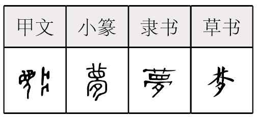 mènɡ形声,甲骨文从爿(qiánɡ),爿象床形,小篆从夕,夕指夜晚,瞢(ménɡ)省声,隶定为“夢”。本义表示人依床昏睡或睡觉中做梦,引申为昏乱不明、空想或幻想等。宋代俗字、《手头字》、《简化字表》简作“梦”,据草书楷化。 梦 |