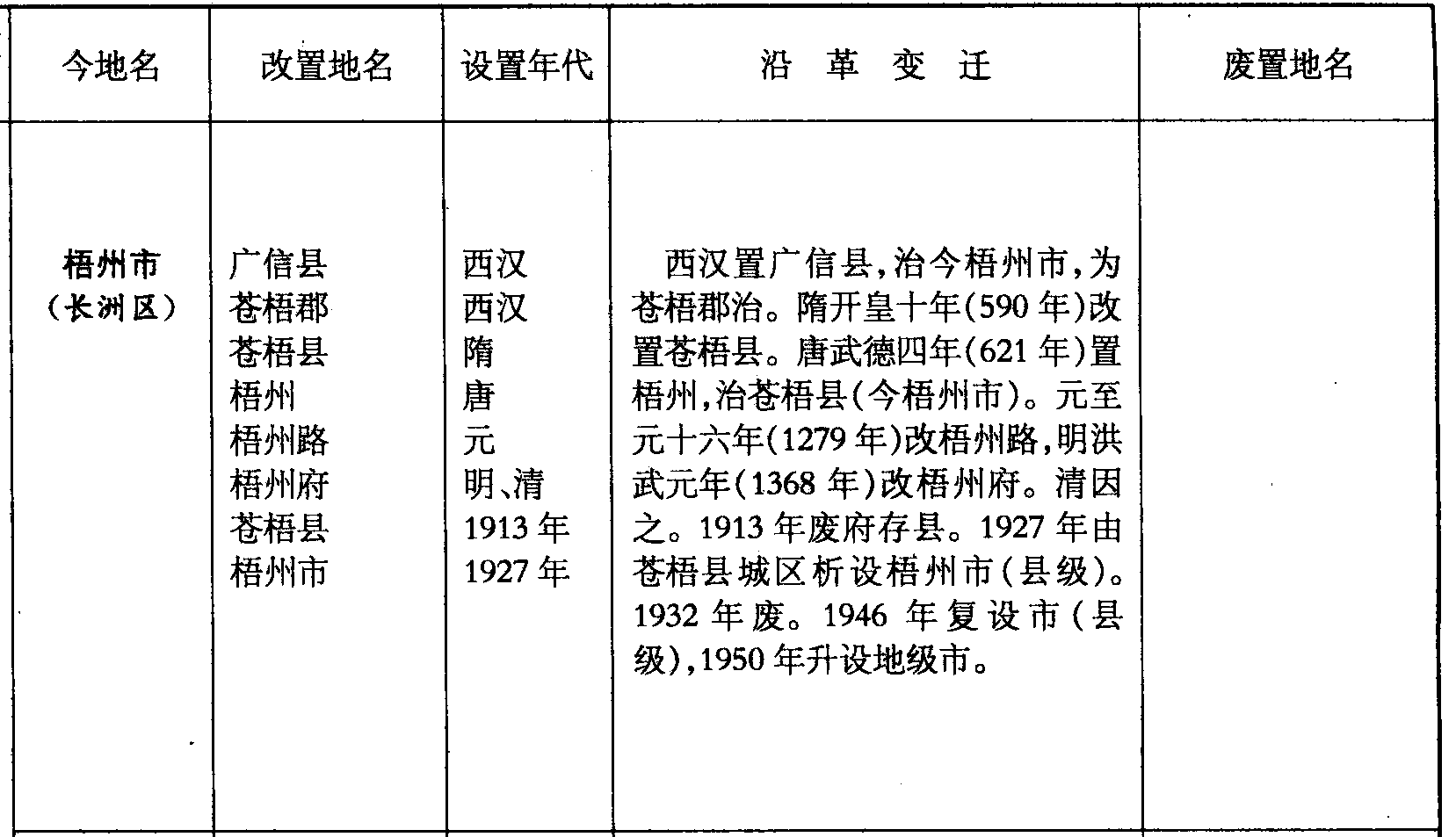 梧州市(长洲区)广信县苍梧郡苍梧县梧州梧州路梧州府苍梧县梧州市西汉西汉隋唐元明、清1913年1927年西汉置广信县,治今梧州市,为苍梧郡治。隋开皇十年(590年)改置苍梧县。唐武德四年(621年)置梧州,治苍梧县(今梧州市)。元至元十六年(1279年)改梧州路,明洪武元年(1368年)改梧州府。清因之。1913年废府存县。1927年由苍梧县城区析设梧州市(县级)。1932年废。1946年复设市(县级),1950年升设地级市。
