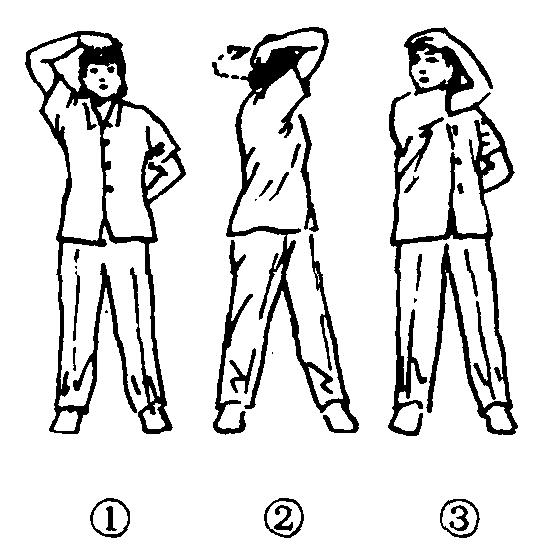 练功十八法第6套第3节。动作过程:两脚分立,略宽于肩。❶右掌根紧贴头顶,四指向前,同时屈左臂手背贴腰后。(图2—4—152—❶)❷右掌沿头颅中线往后梳至枕骨,同时向左转体。(图2—4—152—❷)❸右掌根转向前,经头右侧至左侧太阳穴,上体还原,头向右转。(图2—4—152—❸)❹还原成预备姿势。❺~❽同❶~❹动作相同,但方向相反。共做4个8拍。练习时要动作缓慢、连贯。此功法对头晕、眼花、失眠、心悸等有一定的疗效。