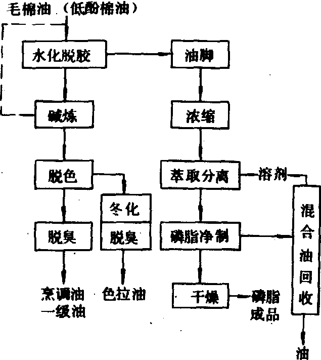 图3 低酚毛棉油精炼工艺流程 饼粕利用 普通棉子中含有棉酚有毒物质,必须脱毒后方可食用或作饲料。从饼粕中提取的棉酚可用于医药或其他工业。主要有三种棉子脱毒方法: ❶高温水热处理法(如蒸炒、压榨、蒸脱烘干等)。可使有毒性的游离棉酚与蛋白质中氨基酸等化合成毒性低的“结合棉酚”,但蛋白质同时变性使营养成分有所损失。 ❷溶剂浸出法。即利用混合溶剂(如乙醇-己烷、丙酮-己烷、二氯甲烷-己烷等)进行选择性低温浸出,将油脂与游离棉酚和蛋白质等进行有效的分离。 ❸化学添加剂法。例如把硫酸亚铁、碱液或者尿素等添加剂加到饼粕中,使棉酚破坏或变成结合状态,通常应用于饲料饼粕。此外,尚有发酵处理法,旋液分离色腺体法等,可供选用。 |