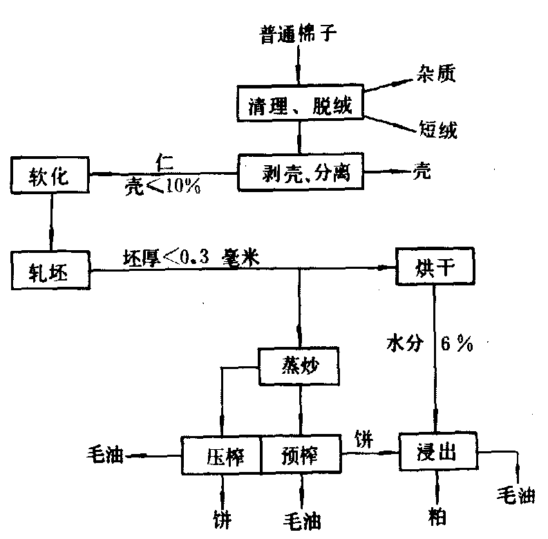 | 释义 | 棉子油制取加工cottonseed oil extraction从棉子种仁中提取油脂,制取棉子饼粕的过程。棉子约占皮棉重量的60%~62%,经轧花后的棉子含短绒8%~14%、壳30%~50%、棉仁48%~60%。整子含油14%~26%,棉仁含油28%~39%、蛋白质30%左右。普通棉子中含有0.8%~2.35%(干基)的游离棉酚色腺体(C30H30O8)(简称棉酚),而低棉酚的棉子中棉酚含量低于棉酚的食用安全国际标准(为0.04%)。与普通棉子相比,低棉酚的棉子颗粒较大,仁中的含油率为31.67%~43%、蛋白质含量为34.44%~37.68%,利用价值更高。
