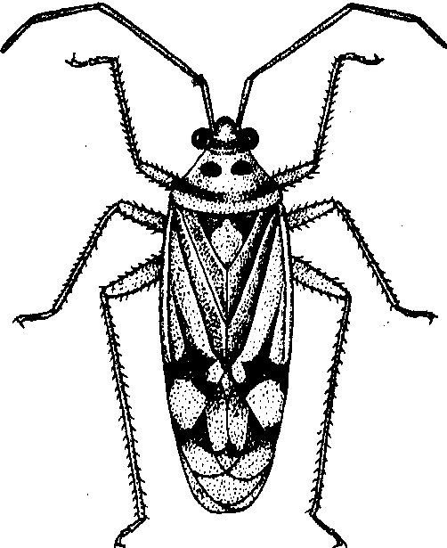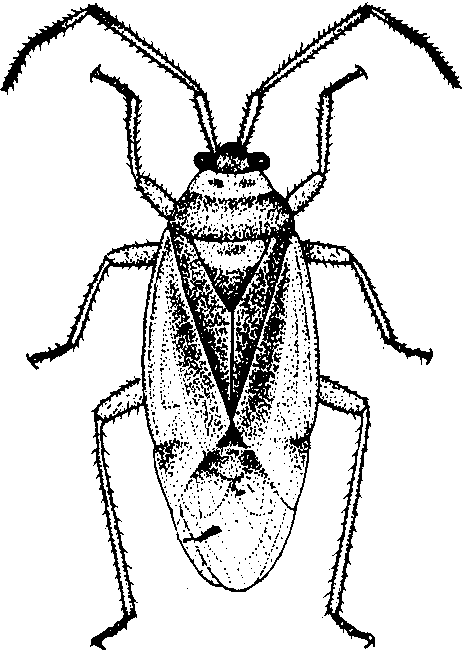 三点盲蝽 学名Adelphocoris faciaticollis Reu-ter。成虫体长约7毫米,黄褐色,前胸背板后缘有一黑横纹,前缘有2黑斑,小盾片与两个楔片呈3个明显的黄绿三角形斑。若虫体黄绿色,有黑色细毛,触角第二至第四节基部淡青色,余赭红色,足淡青色,有赭红色斑点(图2)。卵长茄形、淡黄色。分布以北方棉区为主。年生3代。以卵在洋槐、加拿大杨、柳、榆、杏等树皮内越冬,卵大部产于有疤痕或断枝的疏软部位。卵发育起点8℃,有效积温188 日度。幼虫发育起点7℃,有效积温373 日度。越冬卵5月上旬开始孵化,幼虫5龄,经约26天到5月下旬至6月上旬羽化,成虫寿命约15天。第二代卵期约10天,若虫期约16天,7月中旬羽化,成虫寿命约18天。第三代卵期约11天,若虫期约17天,8月下旬羽化,成虫寿命约20天,后期世代重叠。各代成虫晚间产卵,约有半数卵产于棉花的叶柄与叶片相接处,其次为叶柄及主脉附近。白天成虫在向日葵、玉米、大麻、葎草等花内取食。主要寄主有棉、马铃薯、豆类、胡萝卜、向日葵、芝麻、玉米、高粱、小麦、番茄等。