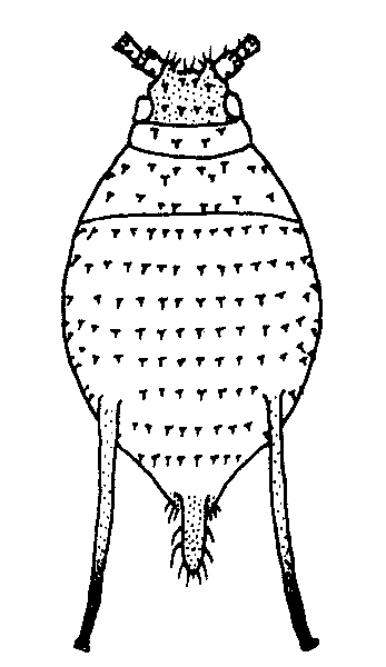 | 释义 | 棉长管蚜big cotton aphid偶发性棉、豆类作物的刺吸害虫。又名棉无网长管蚜、大棉蚜。学名Acyrthosiphon gossypii Mordvilko。同翅目,蚜科。分布于印度、土耳其、伊拉克、以色列、埃及、阿尔及利亚、苏丹、苏联; 中国仅分布于新疆和甘肃。寄主植物有棉、苦豆子、骆驼刺,也可取食圆叶锦葵、黑绿豆、蚕豆、木田菁、豇豆、甘草、草藤眉豆、芽豆和绿豆等。无翅孤雌蚜体长3.7毫米,草绿色,被蜡粉,附肢色淡,仅触角第二至第六节关节处及第六节基部与鞭部相接处、喙顶端、各腿节顶端及跗节、各胫节端部、腹管顶端、尾片尾板及生殖板深色。头部额瘤外倾,触角稍长于身体,第六节鞭部为基部的3~4倍,第三节基部有小圆感觉圈1~3个,腹管很长,约等于触角第四、五两节之和,可达体长之半或1/3,尾片有长毛8~12根(见图)。有翅孤雌蚜触角第三节基部2/3有小圆感觉圈10~20个。