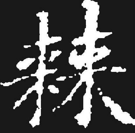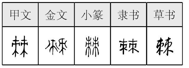棘 篆 隶jí 【析形】 会意字。古文字形从二朿,朿是刺的本字,从朿表示与刺有关。【释义】 《说文》:“小枣丛生也。”本义指酸枣树。枣树枝上有刺,故泛指有芒刺的草木。[披荆斩棘]砍伐荆棘。比喻扫除前进中的困难和障碍。【shape analysis】 It is the associative character. In ancient character its meaning is related to two 朿(cì, bouquet)which is the origin of 刺( cì, thorn). It relates to the thorn. 【original meaning】 The jujube tree.