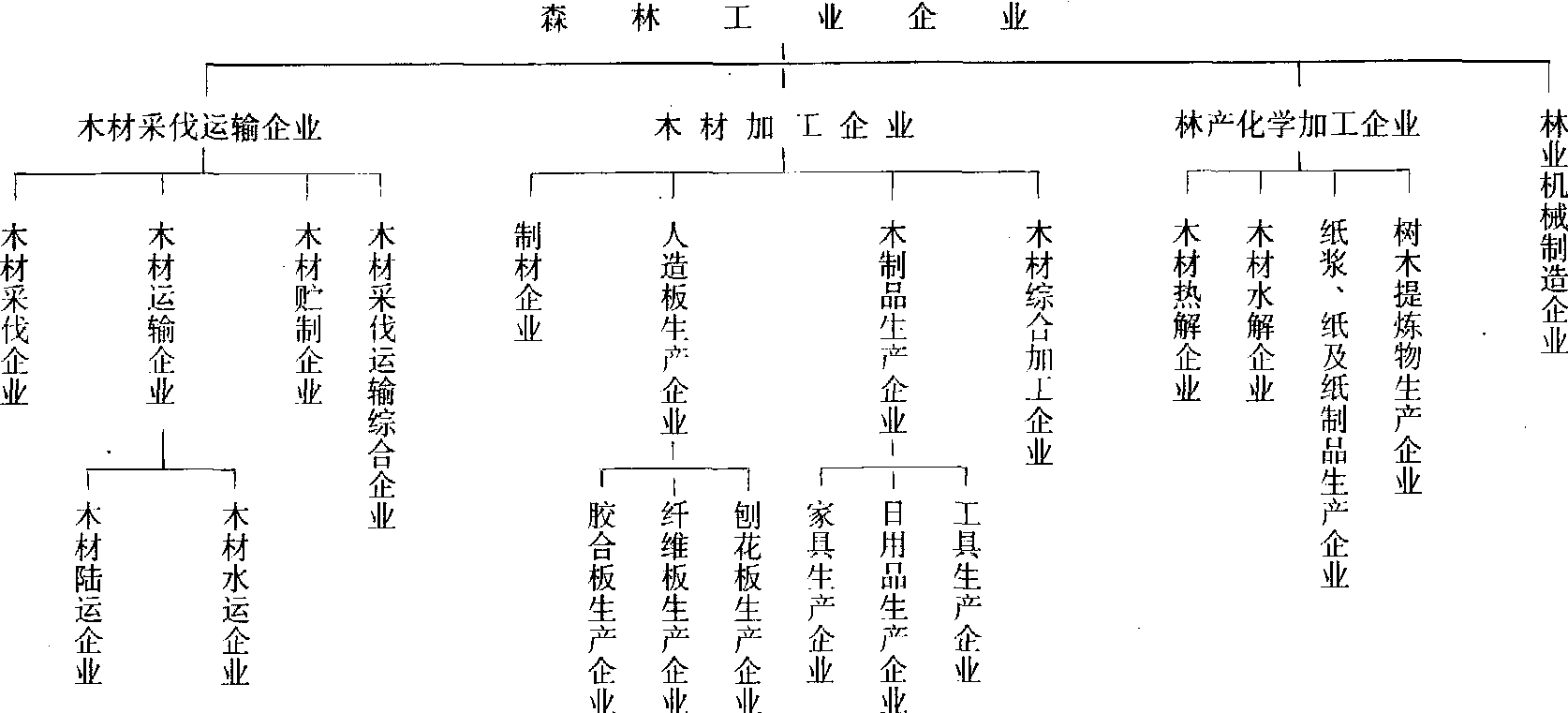 森林工业企业forest industrial enter-prise从事木材采运、木材加工、林产化工和林业机械制造等生产经营活动,并实行独立经济核算的单位。简称森工企业。森林工业企业是林业部门的基本经济单位,是国民经济现代化建设及人民生产、生活不可缺少的物质资料——木材和其他林产品的主要生产者和经营者。 中国的森工企业按生产资料所有制性质和形式可分为全民所有制企业(国营企业)、集体所有制企业、合资经营企业、私营企业和个体企业;按隶属关系可分为中央企业、地方企业和乡镇企业;按规模可分为大、中、小型企业;按组织结构可分为单厂企业、多厂企业和联合企业;按生产过程特点分的企业如图所示。