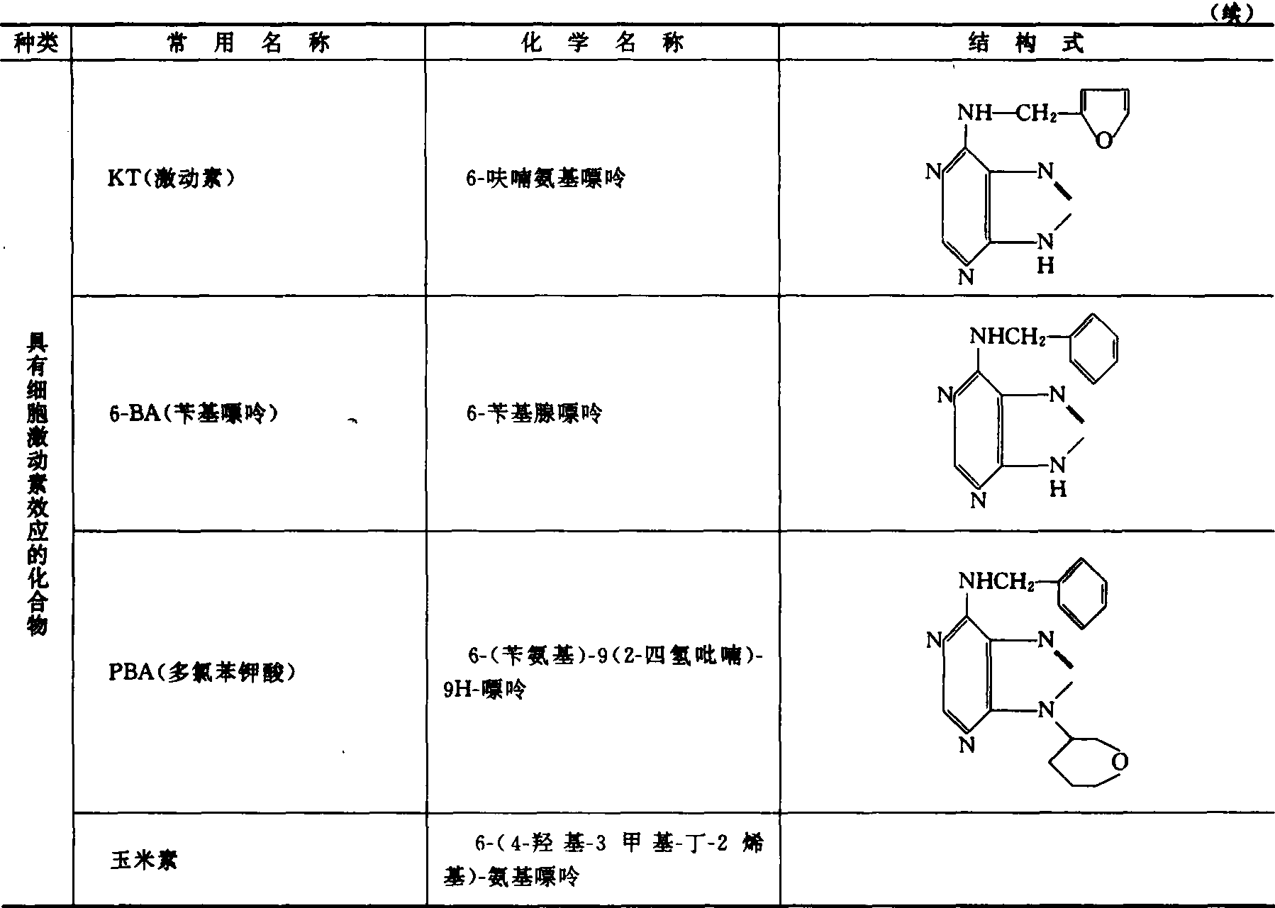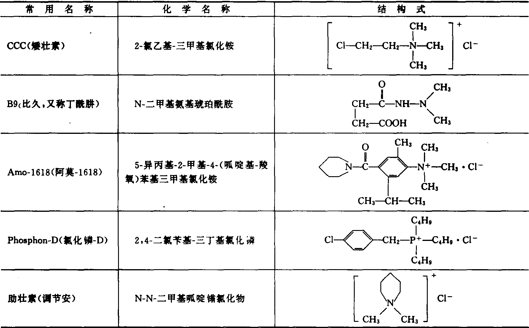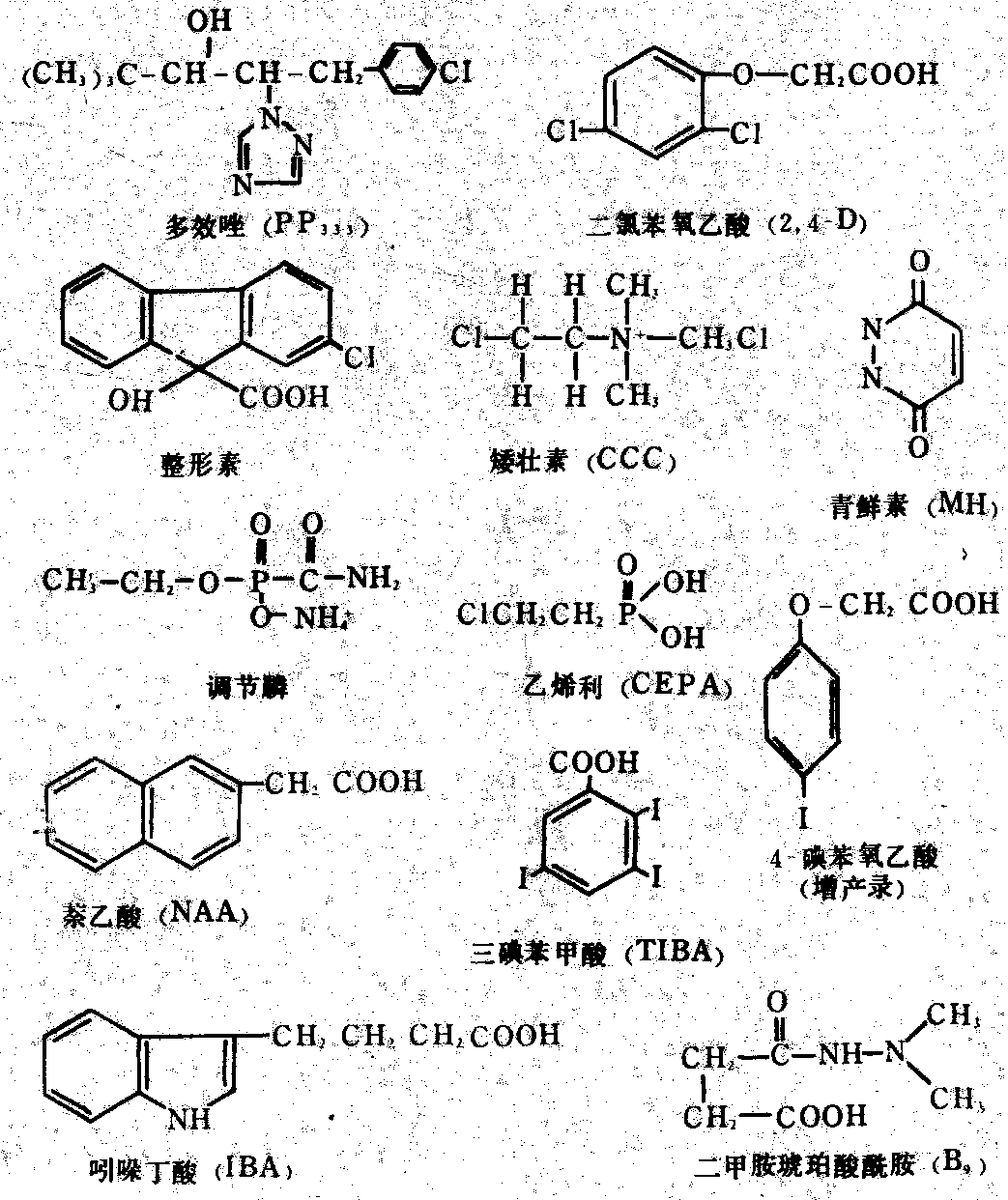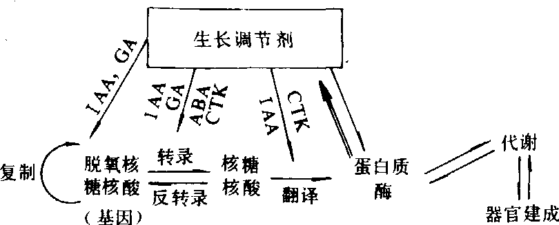 注: +表示正效应; -表示负效应;+ - 表示有双重效应 生长调节剂能有以下作用: 促进种子萌发和插条生根; 诱导成花或疏花疏果; 改变花期避免霜冻; 促进单性结实;调节成熟期以增加果实贮藏性, 或便于机械化采收; 促进或抑制营养生长等。有些作用是一种生长调节剂单独引起, 有的则是两种或多种生长调节剂相互协调, 或相互颉颃, 达到某种平衡而表现出效应。每种生长调节剂都是在一定的植物组织或器官,在遗传物质的信息中发挥作用(见图)。 ![]() 生长调节剂和遗传信息表达和器官建成的关系图解 种类与效应 生长调节剂按其效应分为5大类,即生长素、赤霉素、细胞分裂素、乙烯及生长抑制剂与延缓剂。但有些生长调节剂由于使用时期和浓度不同, 而可以发挥不同的效应。 生长素类 1934年,首先由F.克格尔F. Kogl等从燕麦胚芽鞘中分离得到吲哚乙酸, 不久又发现并合成了吲哚丁酸(IBA)、吲哚乙腈 (IAN)、吲哚乙醛(IAAld) 等;萘乙酸及其同系物: 萘乙酸 (NAA)、萘丙酸(NPA)、萘氧乙酸 (NOA); 苯酚化合物:(2,4-DP), 2, 4, 5-三氯苯氧乙酸(2,4,5-T), 2,4,5-三氯苯氧丙酸(2, 4, 5-TP)、4-氯苯氧乙酸 (4-CPA)等。生长素在果树上, 可以促进生根, 防止落果、疏花疏果、抑制萌蘖枝的发生。生长素的生理作用是使细胞伸长, 促进形成层活动, 影响顶端优势和防止衰老等。这些作用通过影响原生质膜的生理功能, 促进核糖核酸(RNA)的合成而实现。 赤霉素类 1926年, 日本黑泽在中国台湾研究水稻病害时发现。20世纪50年代, 英、美开始生产赤霉素, 中国也合成了赤霉酸(GA3)。赤霉素是一类同分异构化合物, 由于广泛存在于高等植物, 所以不断发现新的异构体, 目前已知有GA1~GA73。商品有赤霉酸(GA3)普洛马林(promalin) GA4+7和GA1+2等几种。赤霉素能使果树新梢节间伸长, 促进新梢生长, 打破休眠, 和促进苹果、山楂、枣、柑橘、穗醋栗、无花果, 以及巴梨等多种果树的坐果, 能使核果类单性结实,使玫瑰露葡萄形成正常大小的无籽果粒,防止柑橘果皮衰老, 推迟柑橘和香蕉的成熟, 抑制苹果、梨、山楂、桃、柑橘、长山核桃等果树的花芽分化。赤霉素只溶于醇类、丙酮, 难溶于水。施于植物后, 在体内移动性差。其作用通过促进α淀粉酶的合成, 防止IAA的分解, 促进RNA的合成。 细胞分裂素 1913年,哈尔洛特(Haherlaudt)发现有刺激细胞分裂的激素,1948年斯科格(F. Skoog)与崔澂也指出嘌呤有促进细胞活力的微弱作用。但第一种细胞分裂素, 直到1956年才被米勒 (C.O.Mil-ler)等人鉴定为6-呋喃氨基嘌呤。其后, 发现了玉米素〔6-(4羟基-3-甲基-3-反式丁烯基)氨基嘌呤〕,人工合成的有细胞分裂素(Verdan、BA、BAP) , 激动素和PBA等。此外,二苯脲(DPU)和苯莱特, 也有促进细胞分裂的活性。这类活性物质可促进葡萄坐果, 提高新梢、侧芽的萌发率, 增大分枝角度, 促进花芽分化,也可使葡萄雄花变为两性花, 防止衰老。细胞分裂素为脂溶性。根尖是细胞分裂素合成的部位,随上行液流向正在进行细胞分裂的部位移动。幼果和未成熟的种子含量较多,伤流中也可发现。细胞分裂素,通过影响核酸或蛋白质的合成或降解, 实现其生理效应。 乙烯发生剂 乙烯催熟的原理,早为人们利用。中国古代用瓷缸密封, 使柿子脱涩; 美国加利福尼亚州用煤油炉加温的篷帐, 使青色柠檬变黄, 都是利用果实本身或煤油不完全燃烧所产生的乙烯。20世纪70年代, 把乙烯作为一种生长调节剂。商品的乙烯发生剂有乙烯利 (Ethrel Ethephon CEPA), 被果树吸收后, 在pH4.1以上, 即分解释放乙烯; CGA-15281〔2-氯乙基-三(乙甲氯乙氧)硅烷〕,是在体外发生乙烯而后进入植物体内。乙烯具有抑制新梢生长、促进花芽分化、疏除花果、促进成熟和促使果梗离层形成等作用; 晚秋喷布, 能使翌年花期延迟。乙烯可以促进多种酶的活性,并可使生长素分解, 或抑制其合成,或阻滞其向先端运输而生长素水平下降。 生长抑制剂 自1949年第一次发现烟碱类化合物具有生长延缓作用以来,已在多种植物内找到抑制剂,如脱落素、酚和酚基类黄酮化合物。其中有的对生长起延缓作用, 有的通过破坏生长细胞分裂而起抑制作用。天然的生长抑制剂,大多数是芳香族的有机物质,存在于休眠期的种子、芽或枝条中, 制约着休眠, 如脱落酸、苯甲酸、香豆素、肉桂酸和核桃酮等; 人工合成的生长抑制剂, 有青鲜素(MH、马来酰肼、抑芽丹)、代剪灵(aikegulae)、调节膦(krenite)和 off-shoot-o(高级脂肪酸的混合物)等。作用于顶端分生组织,抑制细胞分裂,干扰核酸的形成, 甚至可使幼嫩部分枯萎脱落, 起剪梢作用。它的作用不能被赤霉素所逆转。由于顶端优势受抑, 可以促进侧芽萌发成分枝。三碘苯甲酸(TIBA)和整形素 (9-羟基-9 羧酸芮的衍生物),有促进仁果类、核果类花芽分化, 提高坐果或疏果, 分枝角度开张及矮化作用。其作用机理是抑制生长素和赤霉素的生物合成及传导, 在分生组织中抑制有丝分裂; 人工合成的生长延缓剂, 常见的有矮壮素(CCC、CYCOCEL、Chloromequat),矮健素、B9(比久、B 995、Alar,daminozide、SADH),多效唑(控长灵PP333、Paclobutrazol cuttar)。这类调节剂的主要效应,是能使新梢节间变短而抑制生长,达到矮化和促进花芽分化的目的, 也有提高仁果类坐果、疏除核果类果实的效应。B9还有抑制果实生长、防止苹果采前落果、推迟仁果类果实成熟的作用, 从而提高果品品质,减少果实生理病害, B9
