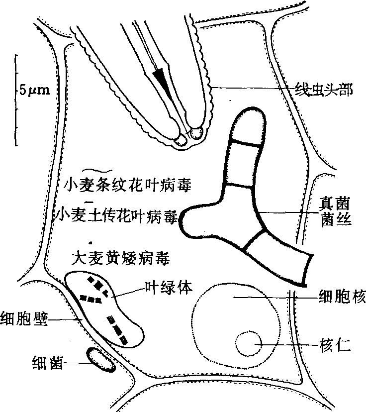 植物病原物和寄主植物细胞的相对大小 (仿G.N.Agrios)