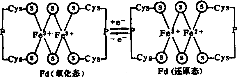 铁在酶系统中有铁—硫蛋白和铁—卟啉蛋白两大类。铁氧还蛋白(ferredoxin,Fd)属于铁—硫蛋白,存在于叶绿体中。叶绿体中有可溶性的铁氧还蛋白及膜结合态铁氧还蛋白。可溶态铁氧还蛋白的分子量为12 000。每1个分子含2个铁原子和2个无机硫原子。其氧化态的2个铁原子均为Fe3+,而还原态中有一个铁原子为Fe2+,从而铁氧还蛋白充当一个电子载体的作用(图2)。铁氧还蛋白具有很高的负氧还电位(-0.43伏特),能还原多种物质,如NADP+、O2、亚硝酸、硫酸盐和血红蛋白(图3)。